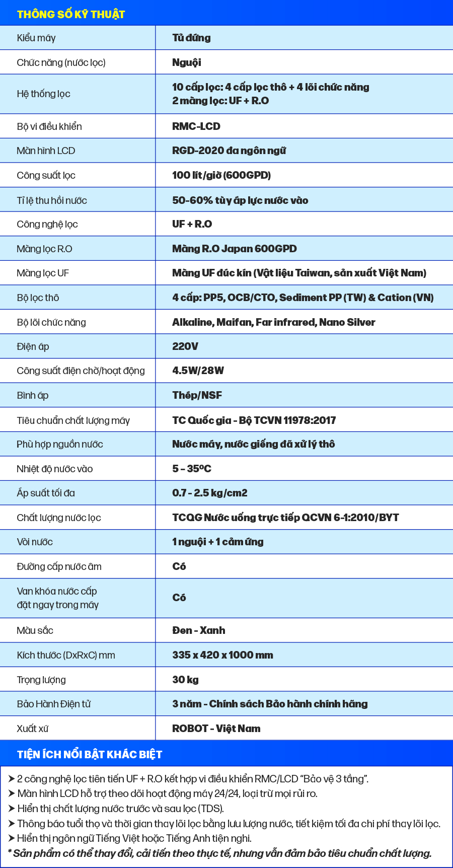 • Công nghệ RMC – LCD độc quyền, biết được chất lượng nước trước & sau lọc   Bộ vi mạch RMC-LCD thông minh thiết kế phát minh của ROBOT, mọi chi tiết vận hành máy được hiển thị trên màn hình LCD, cảnh báo mọi rủi ro cho người sử dụng   Tuổi thọ lõi lọc được tính theo lưu lượng nước sử dụng, không tính theo thời gian ghim điện như các máy thông thường, tiết kiệm tối đa chi phí thay lõi lọc