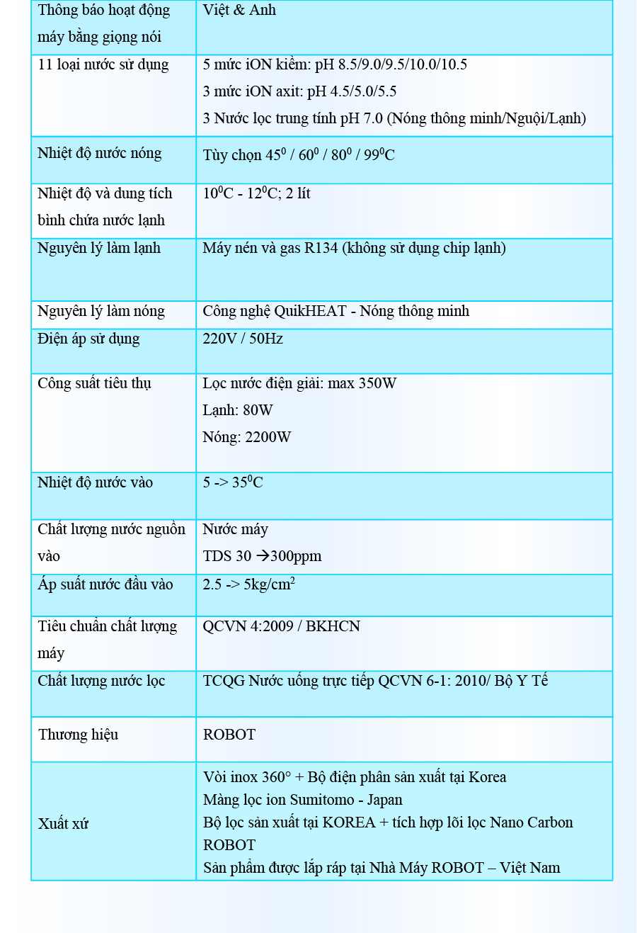 - Và 3 mức nước iON axit (pH 4.5/5.0/5.5). Chất lượng nước đạt chỉ số tối ưu, nồng độ Hydro hoạt tính lên đến ~ 750 -> 850 ppb, chống oxy hóa (ORP) lên đến ~ -350 -> -500 mV, đáp ứng mọi nhu cầu sử dụng trong cuộc sống. Máy lọc nước điện giải iON kiềm Nóng Lạnh ROBOT ionKing là dòng Tủ Đứng đầu tiên trên thế giới, được thiết kế kiểu dáng hiện đại, thiết kế chinh phục mọi không gian. Đặc biệt, được tích hợp thêm chức năng Nóng Thông Minh – Lạnh độc đáo & duy nhất trên thị trường, mang lại nhiều tiện ích cho người dùng. Chỉ số Hydrogen, ORP của nước tùy thuộc số tấm điện cực, đặc tính nguồn nước & “điều kiện đo trong phòng thí nghiệm chuyên nghiệp, đạt chuẩn”. Máy lọc nước điện giải iON kiềm Nóng Lạnh ROBOT ionKing 511, tạo 11 loại nước bổ ích, pH 4.5 --> 10.5 - Đáp ứng mọi nhu cầu trong cuộc sống Có thể tham khảo ý kiến của Bác sĩ hoặc chuyên gia dinh dưỡng để được hướng dẫn loại nước uống phù hợp nhất cho cơ thể. Kiểu dáng hiện đại - Thiết kế chinh phục mọi không gian