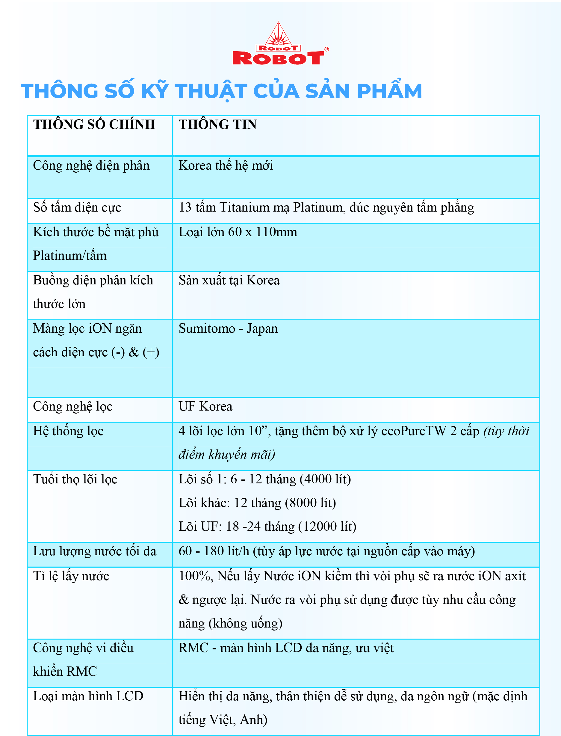 - Hệ thống điều khiển cảm ứng trên mặt phủ kính với màn hình LCD tinh tế +++ Với mong muốn nhiều gia đình Việt có thể sử dụng nước điện giải iON kiềm với chi phí hợp lý để bảo vệ sức khỏe, sắc đẹp & nâng cao chất lượng cuộc sống, ROBOT mang đến sản phẩm “Chất lượng Quốc tế - Giá thành Việt Nam”, phù hợp với mức sống của nhiều người. Tiết kiệm cho người tiêu dùng đến hơn một nửa chí phí so với máy nhập khẩu chỉ từ 30 50%, nhưng sở hữu nhiều ưu điểm, tính năng vượt trội, chất lượng cao.