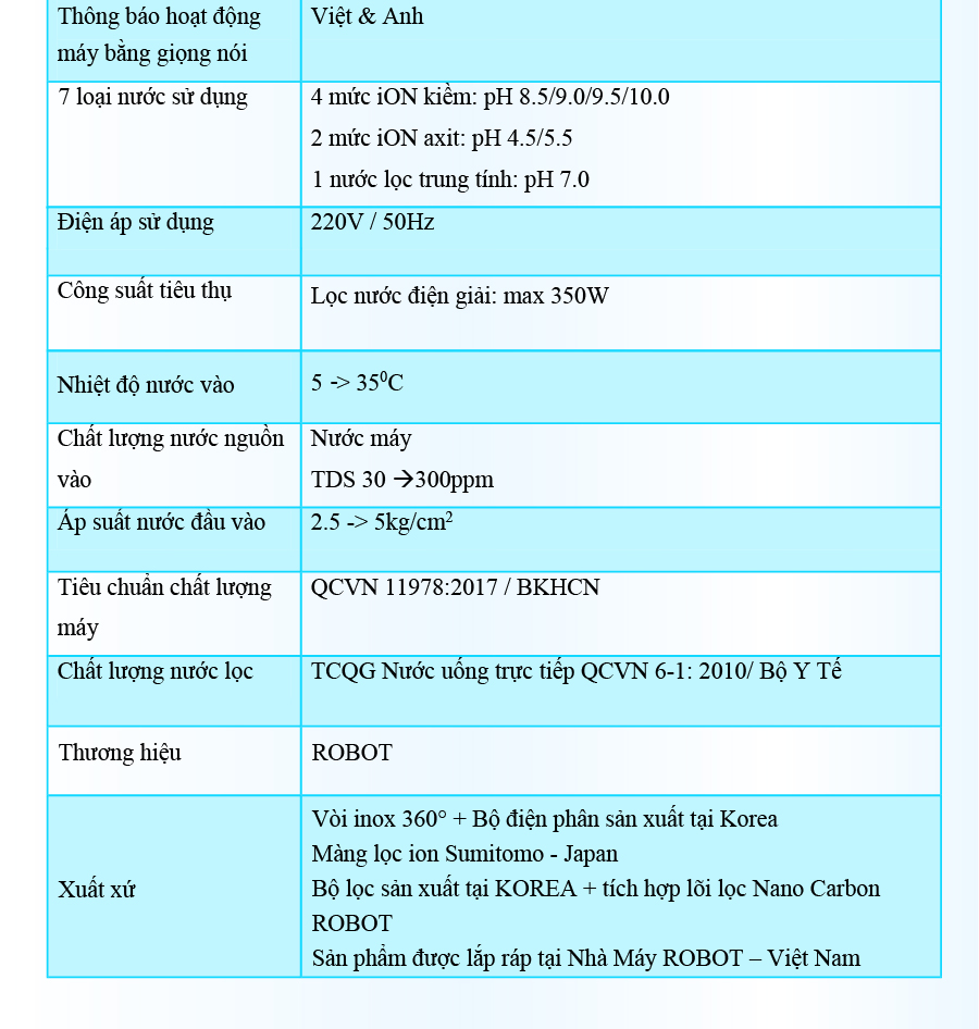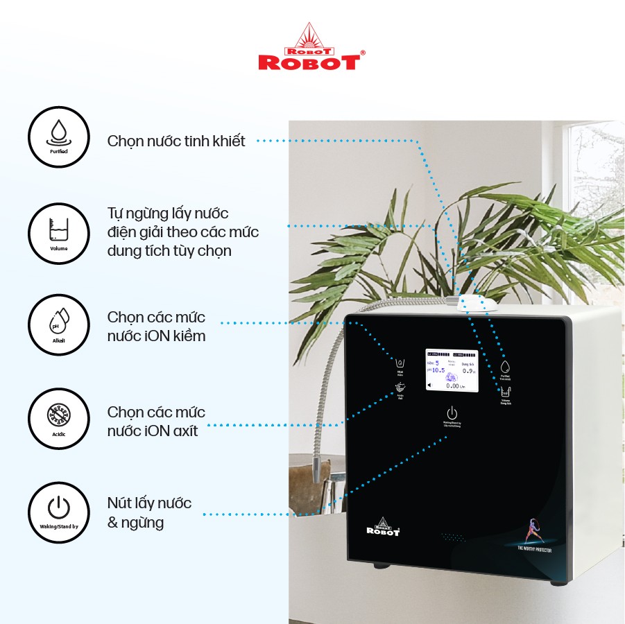 - Với mong muốn nhiều gia đình Việt có thể sử dụng nước điện giải iON kiềm với chi phí hợp lý để bảo vệ sức khỏe, sắc đẹp & nâng cao chất lượng cuộc sống, ROBOT mang đến sản phẩm “Chất lượng Quốc tế - Giá thành Việt Nam”, phù hợp với mức sống của nhiều người. Tiết kiệm cho người tiêu dùng đến hơn một nửa chí phí so với máy nhập khẩu chỉ từ 30 – 50%, nhưng sở hữu nhiều ưu điểm, tính năng vượt trội, chất lượng cao.