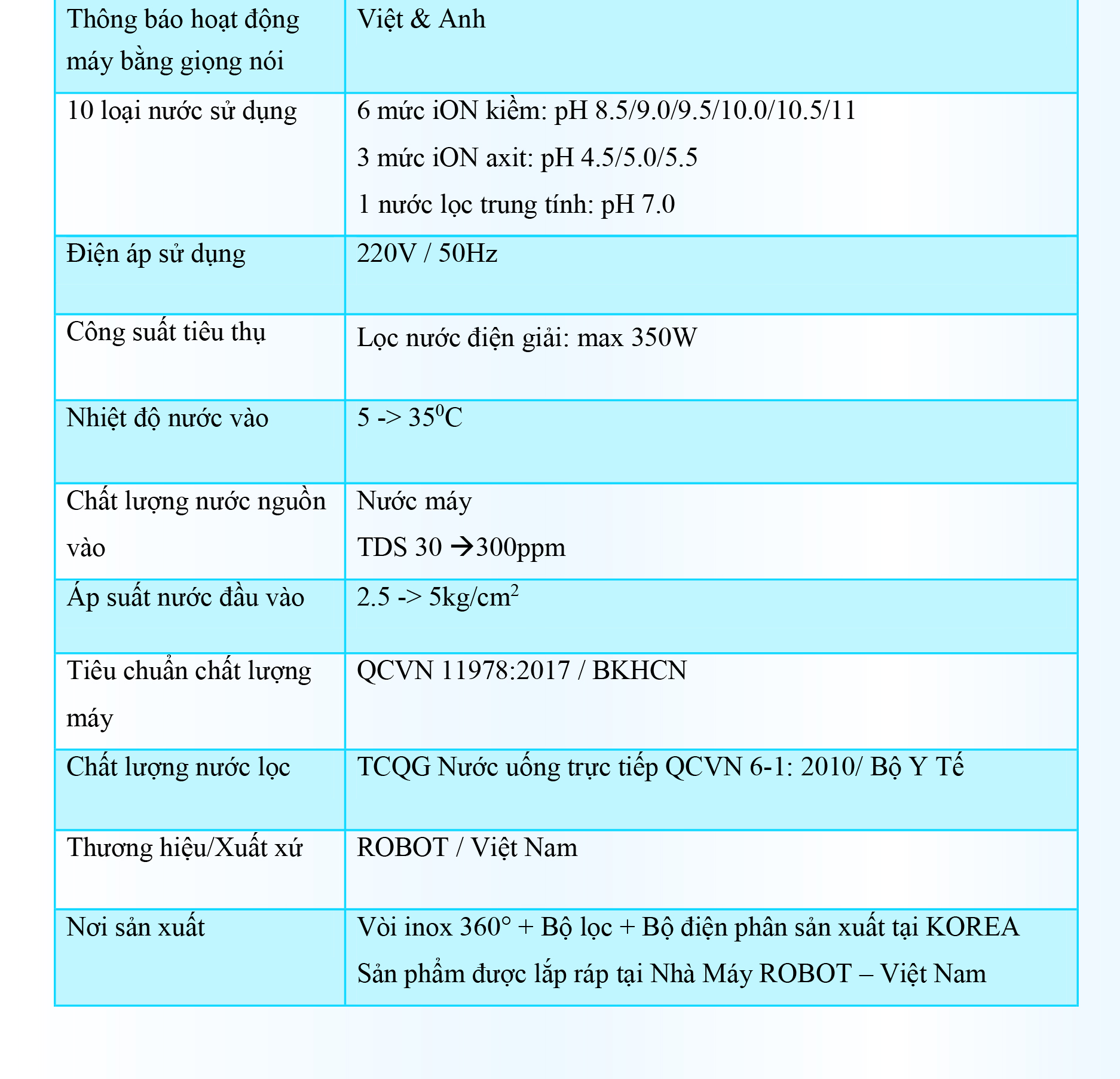 • Tạo 10 loại nước bổ ích, pH từ 4.5 --> 11.0 - Đáp ứng mọi nhu cầu trong cuộc sống