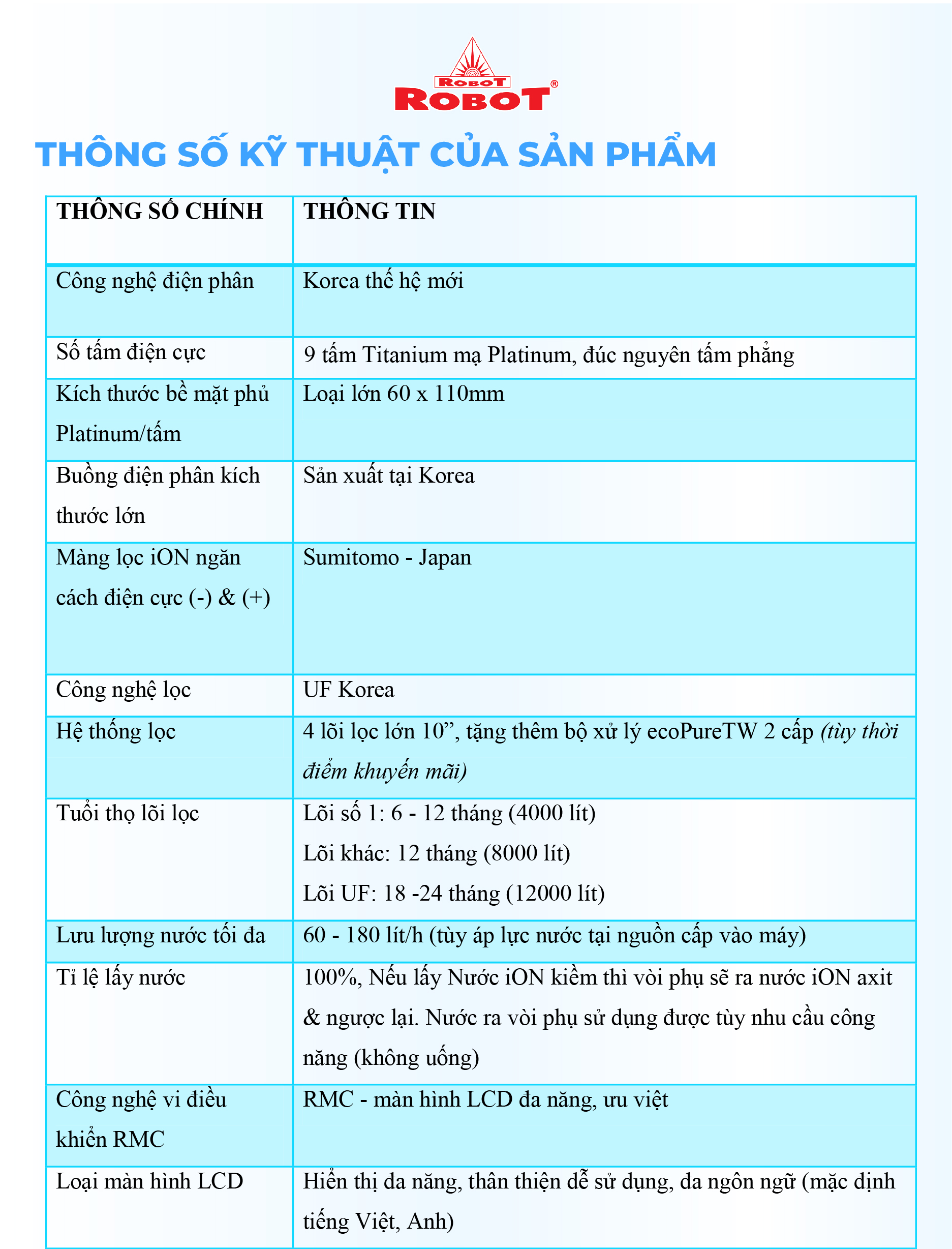 • Hệ thống điều khiển cảm ứng trên mặt phủ kính với màn hình LCD tinh tế   ️ Với mong muốn nhiều gia đình Việt có thể sử dụng nước điện giải iON kiềm với chi phí hợp lý để bảo vệ sức khỏe, sắc đẹp & nâng cao chất lượng cuộc sống, ROBOT mang đến sản phẩm “Chất lượng Quốc tế - Giá thành Việt Nam”, phù hợp với mức sống của nhiều người. Tiết kiệm cho người tiêu dùng đến hơn một nửa chí phí so với máy nhập khẩu chỉ từ 30 - 50%, nhưng sở hữu nhiều ưu điểm, tính năng vượt trội, chất lượng cao. Chế độ bảo hành chính hãng, tận nơi, vật tư và linh kiện, lõi lọc luôn có sẵn hạn chế tối đa chi phí sửa chữa, bảo trì. +++++ VĐV Cầu Lông Nguyễn Tiến Minh – tay vợt từng đứng Top 5 Thế Giới chia sẻ: Sau một thời gian sử dụng Máy lọc nước điện giải iON kiềm Minh thấy cải thiện sức khỏe rất nhiều và tốc độ hồi phục sau tập luyện, thi đấu cũng nhanh hơn so với trước đây. Bây giờ mỗi khi đi tập, hay khi đi thi đấu, Minh đều mang theo nước iON kiềm để uống. ROBOT là một thương hiệu Việt Nam uy tín nên Minh hoàn toàn tin tưởng và lựa chọn Máy lọc nước điện giải iON kiềm ROBOT. ️