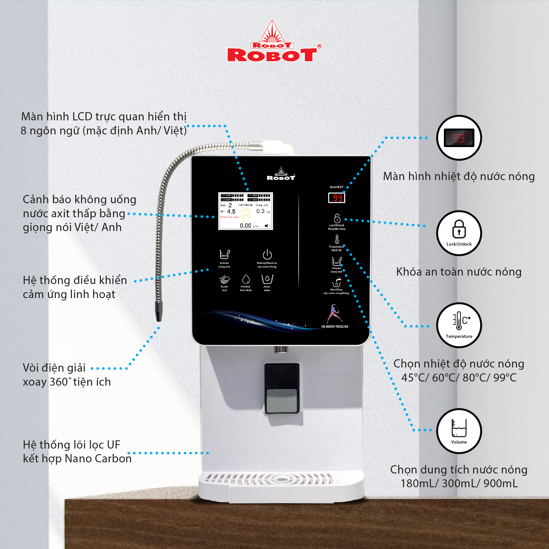 - Và 4 mức nước iON axit (pH 3.5/4.0/4.5/5.5). Chất lượng nước đạt chỉ số tối ưu, nồng độ Hydro hoạt tính lên đến ~ 1500 -> 1800 ppb, chống oxy hóa (ORP) lên đến ~ -850 -> -1000 mV, đáp ứng mọi nhu cầu sử dụng trong cuộc sống. Máy lọc nước điện giải iON kiềm Nóng Lạnh ROBOT ionQueen là dòng Để Bàn đầu tiên trên thế giới, được thiết kế kiểu dáng hiện đại, thiết kế chinh phục mọi không gian. Đặc biệt, được tích hợp thêm chức năng Nóng Thông Minh – Lạnh độc đáo & duy nhất trên thị trường, mang lại nhiều tiện ích cho người dùng. Chỉ số Hydrogen, ORP của nước tùy thuộc số tấm điện cực, đặc tính nguồn nước & “điều kiện đo trong phòng thí nghiệm chuyên nghiệp, đạt chuẩn”. Máy lọc nước điện giải iON kiềm Nóng Lạnh ROBOT ionQueen 1113, tạo 13 loại nước bổ ích, pH 3.5 --> 11.0 - Đáp ứng mọi nhu cầu trong cuộc sống Có thể tham khảo ý kiến của Bác sĩ hoặc chuyên gia dinh dưỡng để được hướng dẫn loại nước uống phù hợp nhất cho cơ thể. Kiểu dáng hiện đại - Thiết kế chinh phục mọi không gian ● Kiểu dáng để bàn, khác biệt so với các dòng điện giải khác ● Sử dụng linh hoạt cho mọi không gian ● Vòi nước điện giải xoay 360° ● Hệ thống điều khiển cảm ứng trên mặt phủ kính với màn hình LCD tinh tế Với mong muốn nhiều gia đình Việt có thể sử dụng nước điện giải iON kiềm với chi phí hợp lý để bảo vệ sức khỏe, sắc đẹp & nâng cao chất lượng cuộc sống, ROBOT mang đến sản phẩm “Chất lượng Quốc tế - Giá thành Việt Nam”, phù hợp với mức sống của nhiều người. Tiết kiệm cho người tiêu dùng đến hơn một nửa chí phí so với máy nhập khẩu chỉ từ 30 – 50%, nhưng sở hữu nhiều ưu điểm, tính năng vượt trội, chất lượng cao. Chế độ bảo hành chính hãng, tận nơi, vật tư và linh kiện, lõi lọc luôn có sẵn hạn chế tối đa chi phí sửa chữa, bảo trì. VĐV Cầu Lông Nguyễn Tiến Minh – tay vợt từng đứng Top 5 Thế Giới chia sẻ: Sau một thời gian sử dụng Máy lọc nước điện giải iON kiềm Minh thấy cải thiện sức khỏe rất nhiều và tốc độ hồi phục sau tập luyện, thi đấu cũng nhanh hơn so với trước đây. Bây giờ mỗi khi đi tập, hay khi đi thi đấu, Minh đều mang theo nước iON kiềm để uống. ROBOT là một thương hiệu Việt Nam uy tín nên Minh hoàn toàn tin tưởng và lựa chọn Máy lọc nước điện giải iON kiềm ROBOT. ️Thông Tin Thương Hiệu CÔNG TY CỔ PHẦN ĐẦU TƯ ROBOT