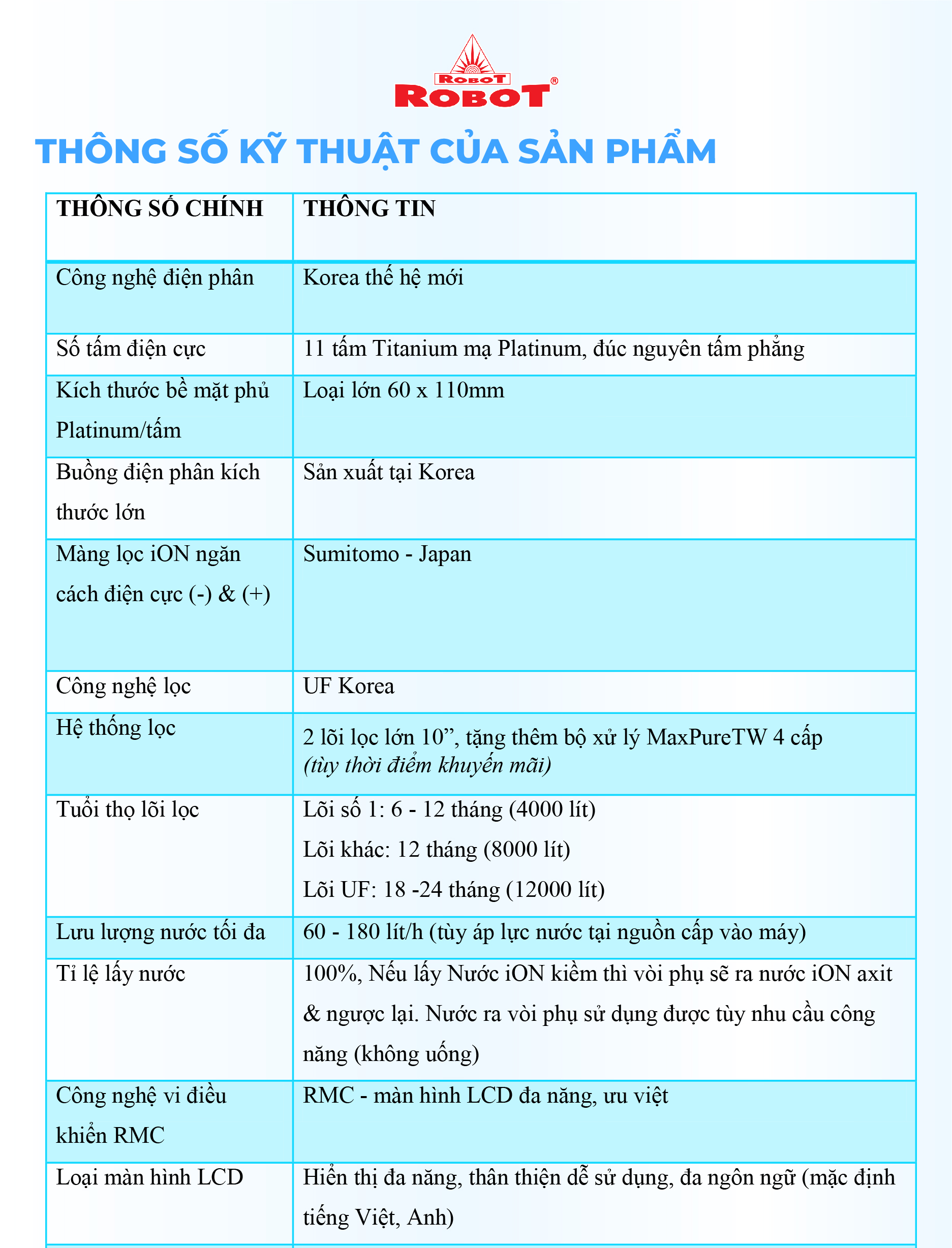 Mua tại TiktokMáy Lọc Nước Điện Giải Ion Kiềm ROBOT IonSmart 1112 Nóng Thông Minh - Tạo 12 Loại Nước Máy lọc nước điện giải iON kiềm ROBOT ionSmart 1112 là sản phẩm được sản xuất với công nghệ tiên tiến, cao cấp trang bị đến 11 tấm điện cực lớn nhất, có khả năng tạo ra đến 12 loại nước đa chức năng:
