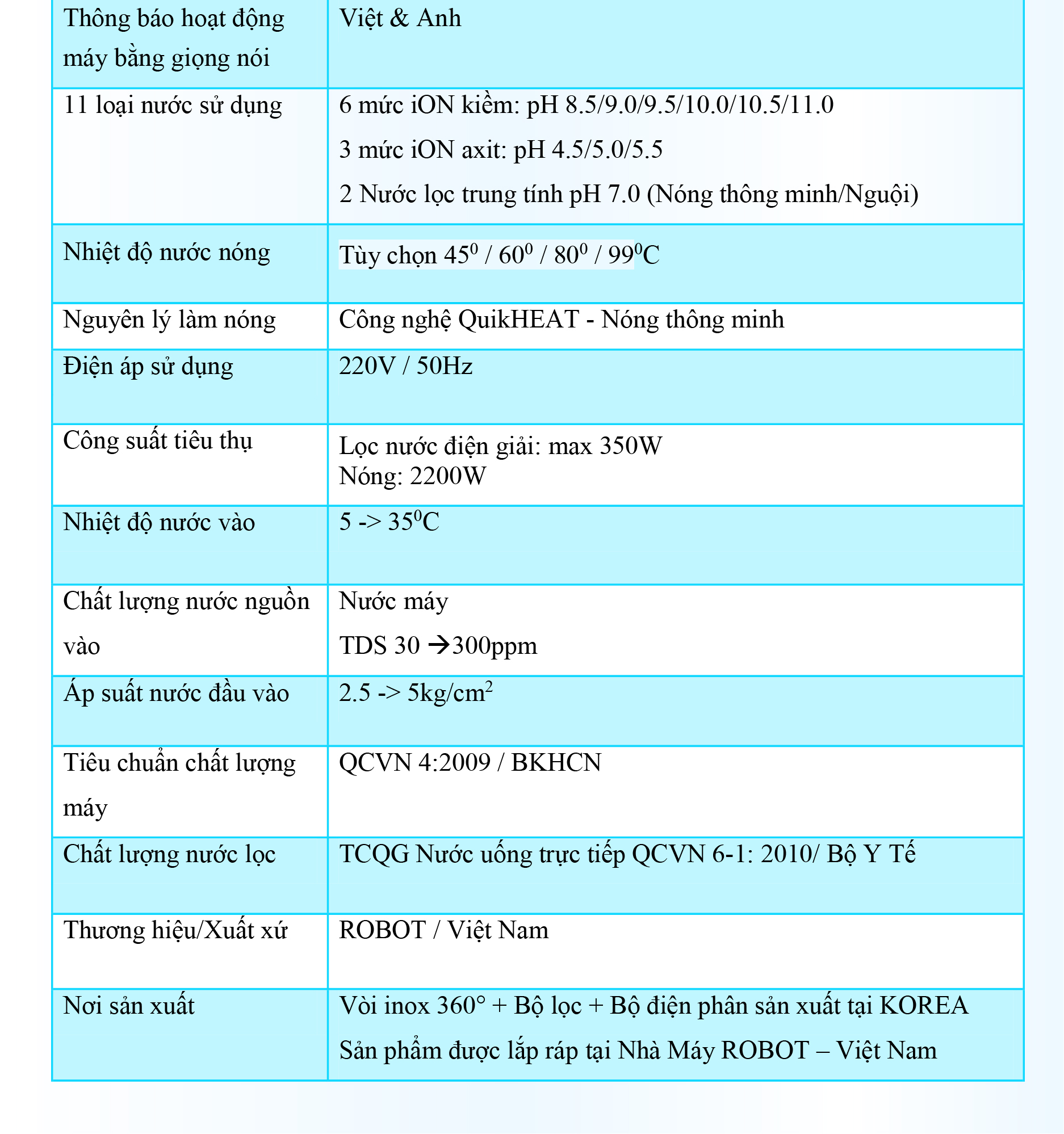 - ️ Máy lọc nước điện giải iON kiềm Nóng ROBOT ionSmart 911 được thiết kế kiểu dáng hiện đại, thiết kế chinh phục mọi không gian. Đặc biệt, bộ sưu tập 5 sắc màu pastel hiện đại đáp ứng mọi sở thích và phong cách nội thất, chắc chắn sản phẩm sẽ là điểm nhấn đặc sắc trong ngôi nhà của bạn. ️ Máy lọc nước điện giải iON kiềm Nóng ROBOT ionSmart 911, tạo 11 loại nước bổ ích, pH từ 4.5 đến 11.0 - Đáp ứng mọi nhu cầu trong cuộc sống