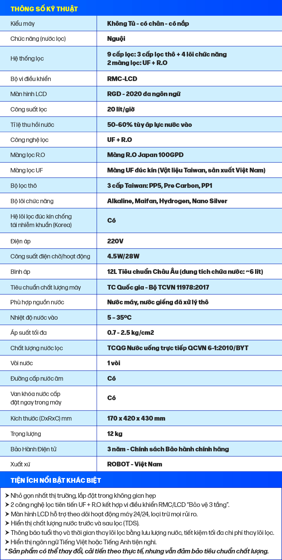 • Các sản phẩm máy lọc nước ROBOT đều sở hữu màn hình LCD sắc nét, hiển thị chi tiết các thông số TDS – chất lượng nước trước & sau lọc, tuổi thọ lõi lọc 24/24… để mọi người đều dễ dàng theo dõi hoạt động máy, chất lượng nước uống thông qua màn hình LCD, loại trừ mọi rủi ro, mang đến sự an toàn tuyệt đối khi sử dụng.   Bộ vi mạch RMC-LCD thông minh thiết kế phát minh của ROBOT, mọi chi tiết vận hành máy được hiển thị trên màn hình LCD, cảnh báo mọi rủi ro cho người sử dụng   Tuổi thọ lõi lọc được tính theo lưu lượng nước sử dụng, không tính theo thời gian ghim điện như các máy thông thường, tiết kiệm tối đa chi phí thay lõi lọc