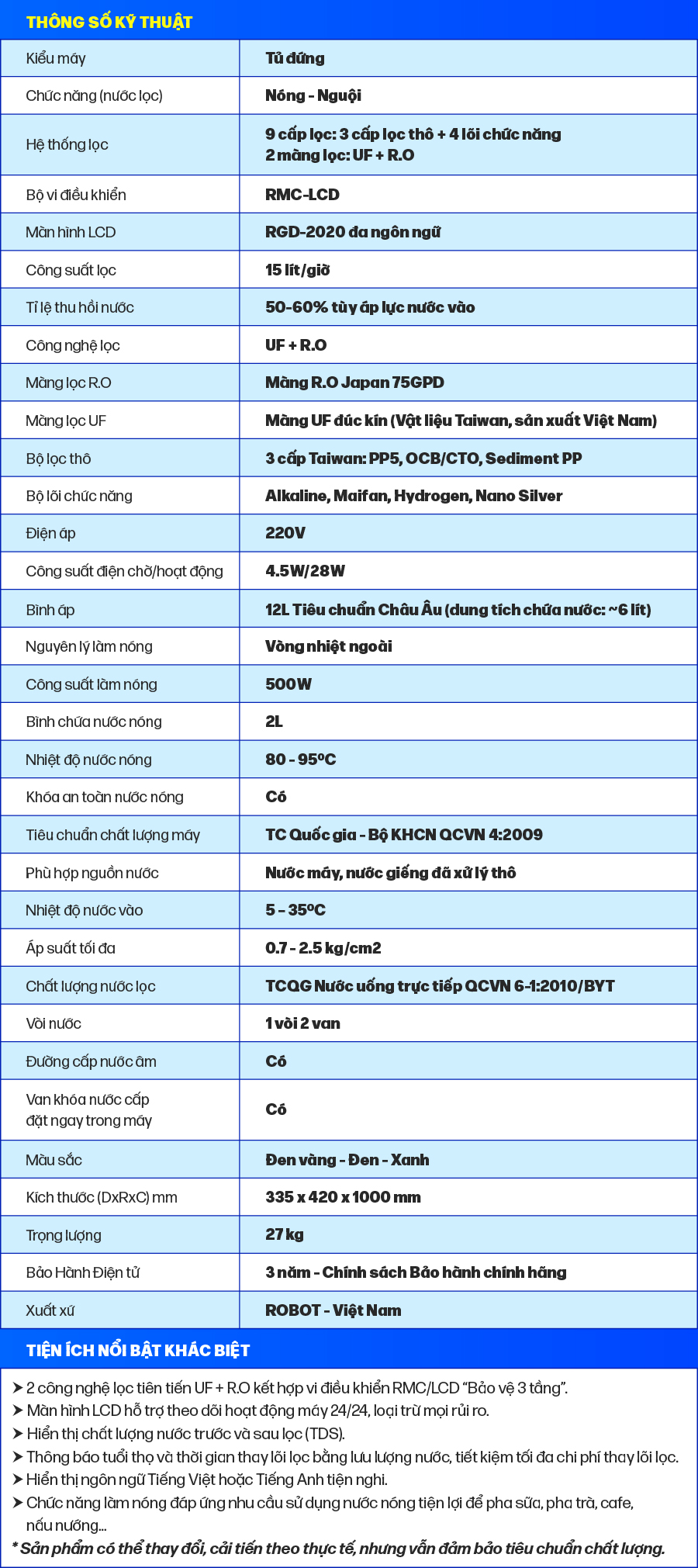 • Công nghệ RMC – LCD độc quyền, biết được chất lượng nước trước & sau lọc Bộ vi mạch RMC-LCD thông minh thiết kế phát minh của ROBOT, mọi chi tiết vận hành máy được hiển thị trên màn hình LCD, cảnh báo mọi rủi ro cho người sử dụng Tuổi thọ lõi lọc được tính theo lưu lượng nước sử dụng, không tính theo thời gian ghim điện như các máy thông thường, tiết kiệm tối đa chi phí thay lõi lọc
