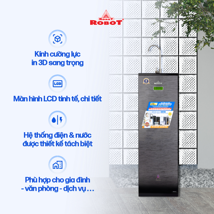 - Các sản phẩm máy lọc nước ROBOT đều sở hữu màn hình LCD sắc nét, hiển thị chi tiết các thông số TDS – chất lượng nước trước & sau lọc, tuổi thọ lõi lọc 24/24… để mọi người đều dễ dàng theo dõi hoạt động máy, chất lượng nước uống thông qua màn hình LCD, loại trừ mọi rủi ro, mang đến sự an toàn tuyệt đối khi sử dụng.