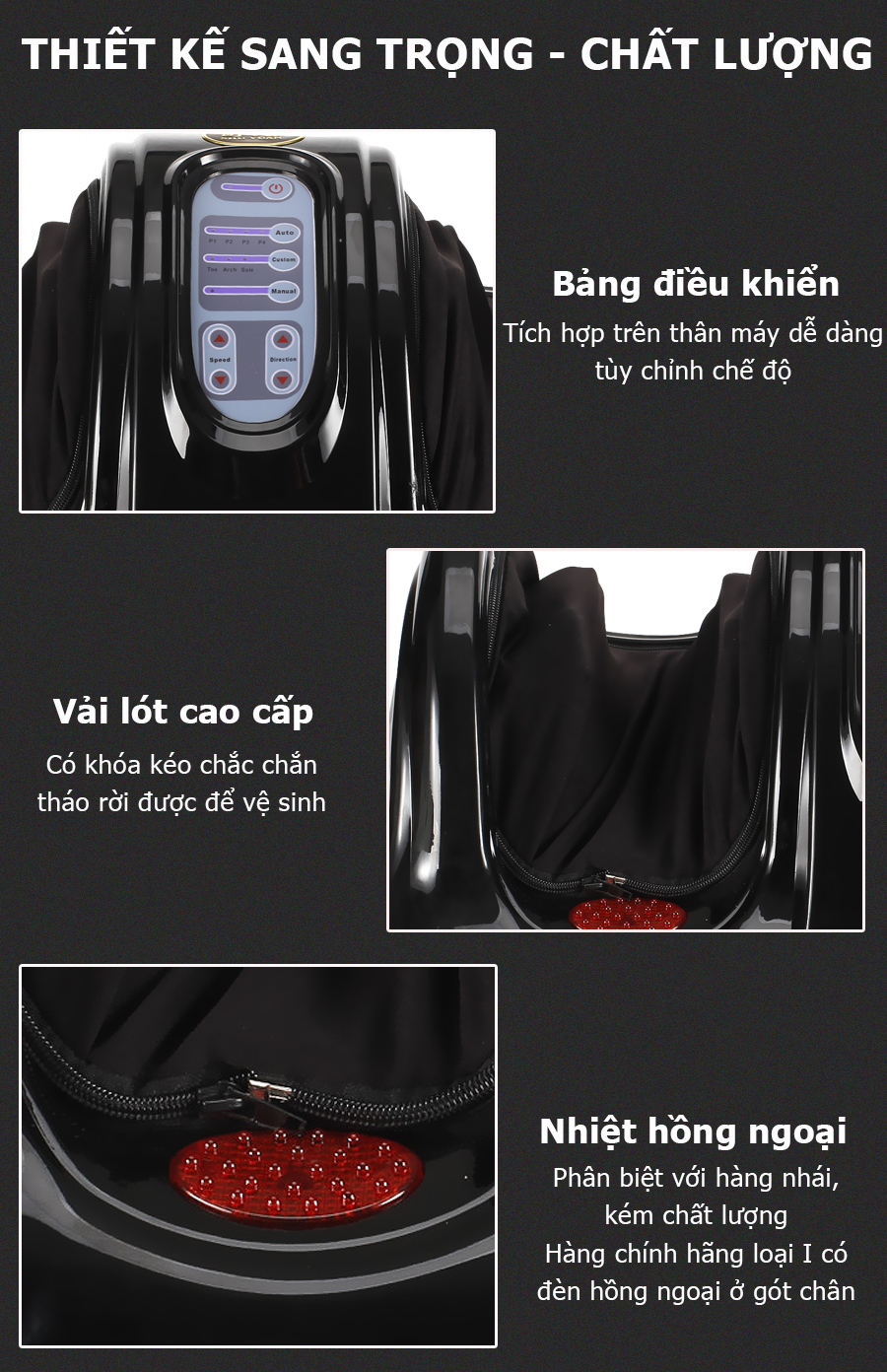 Cài đặt nhiệt độ mong muốn trong khoảng 35-48˚C, có 2 tiếng Bíp kêu khi nhiệt độ đạt được mức cài đặt. Có 8 đèn hồng ngoại tập trung ở dưới gan bàn chân. Có