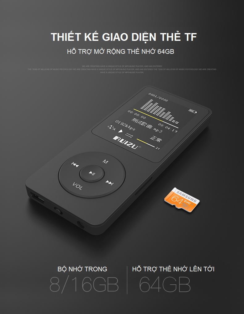 RUIZU X02 là máy nghe nhạc mp3 hỗ trợ nghe nhạc, FM radio, xem video, ghi âm và đọc sách, với bộ nhớ trong 8G và khe thẻ nhớ ngoài tới 64GB giúp bạn thoải mái lưu trữ hàng ngàn bản nhạc và video ưa thích.