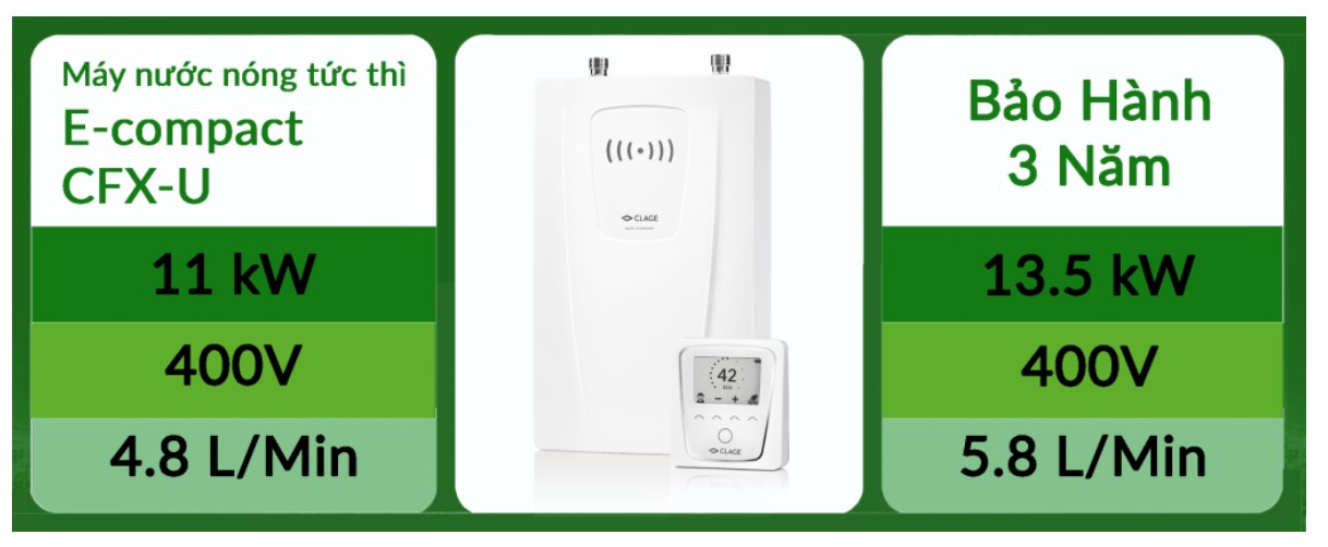 Lắp đặt đơn giản và nhanh chóng Đầu ống kết nối nước phía bên trên – Các mẫu CDX-U, CEX-U và CFX U có đầu ống kết nối nước ⅜” và có chiều hướng lên bên trên. Chúng được thiết kế với vị trí lắp đặt bên dưới chậu rửa và kết nối trực tiếp với đường ống cấp nước hoặc ống nước vào của vòi xả. Khoảng cách từ máy nước nóng tức thì đến vòi rửa càng ngắn sẽ càng đạt hiệu quả cao. Bộ kết nối (Cút nối chữ T và ống nối mềm) được trong bị sẵn trong bộ thiết bị, tạo điều kiện thuận lợi cho việc kết nối vào các vòi dẫn nước hiện có. Tùy chọn phương án lắp đặt: Máy nước nóng tức thì nhỏ gọn dòng C có 2 phương án để lắp đặt là không có lỗ thông hơi hoặc không có lỗ thông hơi. Việc lựa chọn các vòi xả và bộ thiết bị lắp đặt cho các vòi tiêu chuẩn được trình bày tại trang 54 và 55. Đầu ống kết nối nước hướng xuống dưới – Model CEX với đầu ống kết nối nước ½ ” ở bên dưới và chiều hướng xuống, giúp có thể được lắp đặt để sử dụng linh hoạt Giải pháp cho việc nâng cấp: Mô-đun giảm tải Công tắc giảm tải (còn được gọi là chuyển mạch ưu tiên) cho phép sử dụng chung kết nối điện của hai phase điện 400 Volt. Ví dụ, một máy đun nước nóng tức thì CLAGE có thể được vận hành với nguồn kết nối điện hiện có của bếp điện cơ. Khi pha chế nước nóng, máy nước nóng tức thì sẽ tạm thời tắt bếp. Điều này hầu như không đáng chú ý, vì nồi đã duy trì nhiệt độ cần thiết để tiếp tục nấu hoặc nướng trong thời gian ngắn khi nước từ bình nước nóng tức thì CLAGE được sử dụng. > trang 54 Tiết kiệm thêm không gian Kích thước nhỏ của thiết bị tiết kiệm nhiều không gian để lắp đặt các thiết bị khác như cho hệ thống phân loại rác thải hoặc các thiết bị khác. Cài đặt nhiệt độ chính xác với công nghệ hiện đại Việc pha thêm nước lạnh để đạt được nhiệt độ nước tối ưu là không cần thiết. Thiết bị điện tử công suất với công nghệ kiểm soát nhiệt độ kép TTC (TWIN TEMPERATURE Control TTC) đảm bảo kiểm soát nhiệt độ nước đầu ra chính xác với bước cài đặt đến 0,5°C, ngay cả khi áp suất nước không ổn định. Vị trí lắp đặt dưới bồn rửa chén giúp đường ống dẫn nước không quá dài, giảm bớt thời gian chờ đợi để có nước ấm đồng thời tiết kiệm nước. Hoạt động bền bỉ và an toàn Hệ thống kiểm soát an toàn điện tử với khả năng phát hiện bọt khí tồn đọng trong ống dẫn làm tăng độ an toàn và tuổi thọ của thiết bị. Định mức công suất linh hoạt giúp hoạt động thuận tiện Cài đặt công suất hoạt động linh hoạt với Hệ thống thích hợp nhiều nguồn MPS (Multiple Power System MPS), định mức công suất tối đa sẽ được cài đặt tại thời điểm thiết lập các thông số cho máy với các tùy chọn: 6,6 hoặc 8,8 kW 230 V, 11 hoặc 13,5 kW 400 V Hoạt động thuận tiện Điều khiển từ xa cho phép lựa chọn nhiệt độ thuận tiện hơn khi máy nước nóng tức thì với kích thước nhỏ gọn được lắp đặt ẩn dưới bồn rửa bát. Chỉ với một nút bấm, nhiệt độ nước ở đầu ra sẽ được đun nóng chính xác đến nhiệt độ được thiết lập để rửa bát đĩa hoặc rửa tay mà không cần pha trộn thêm nước lạnh tại vòi. Điều khiển từ xa được gắn vào tường với giá đỡ từ tính tiện lợi và chắc chắn. Như một tùy chọn, thiết bị cũng có thể được vận hành thông qua ứng dụng “Smart Control”. Ít cặn vôi bám hơn Hệ thống kiểm soát nhiệt độ nước ấm hiệu quả IES làm giảm gần như toàn bộ cặn vôi giúp thiết bị có tuổi thọ cao hơn, đồng thời dễ dàng bảo trì, bảo dưỡng. Nước được làm nóng tới nhiệt độ cài đặt chỉ vài giây sau khi mở vòi. Thông số kỹ thuật: Ghi chú:
