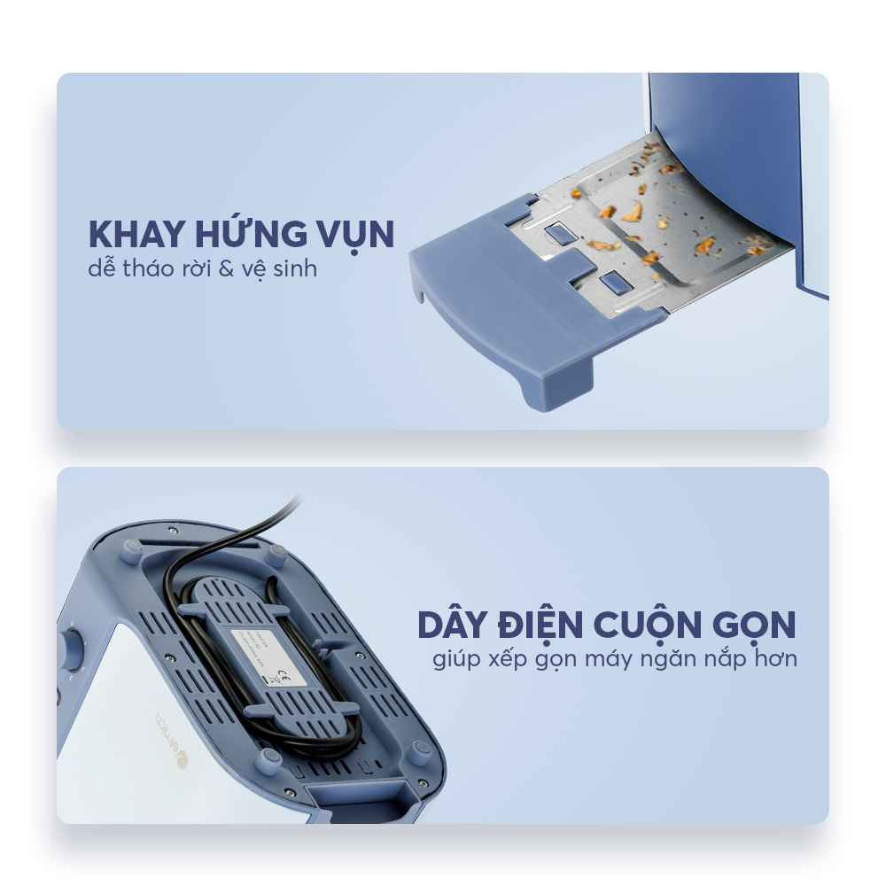 Sáu mức độ nâu có thể điều chỉnh Kẹp bánh mì nướng tích hợp Hai khe nướng bánh mì cực rộng Tự động định tâm bánh mì Đầu gắn bánh mì và ngăn đựng vụn