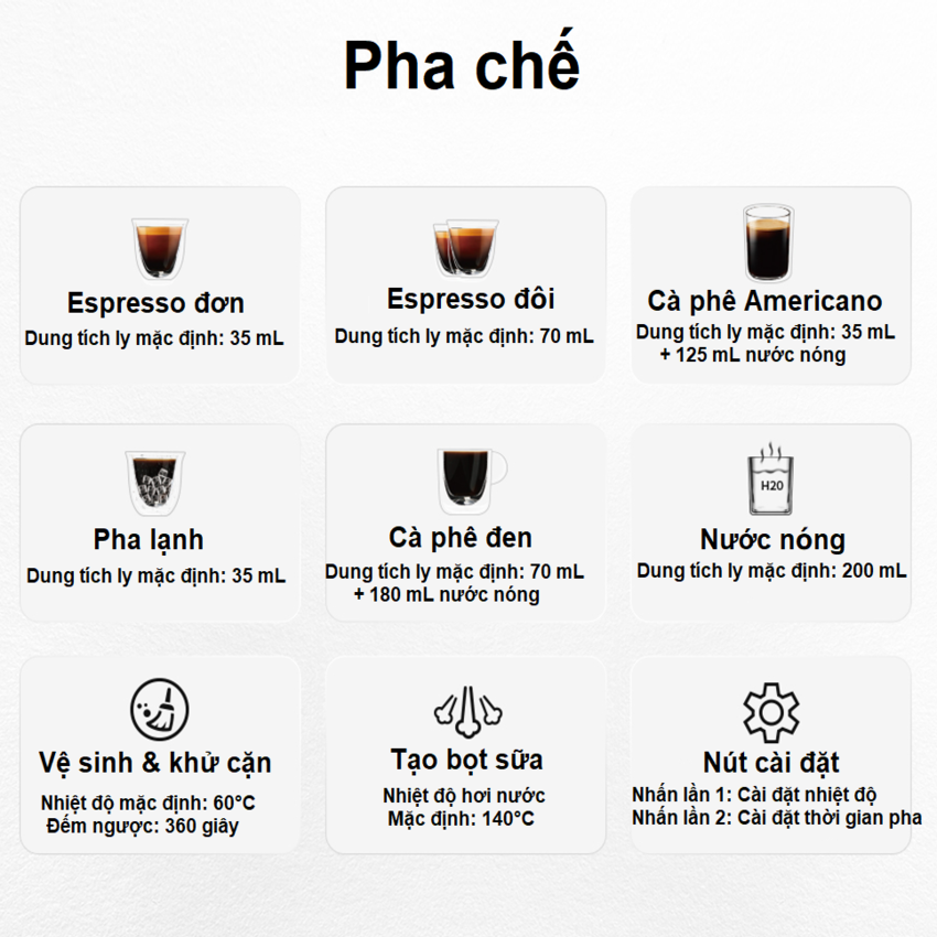 - Chức năng pha cà phê: Cappuccino, Ristretto, Espresso, Latte