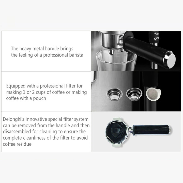 - Đặc biệt, máy còn thiết lập hệ thống điều chỉnh bọt sữa với 2 cấp độ: Bọt kem cho Cappuccino hoặc sữa nóng cho Caffe Latte kiểu Ý với thiết kế vòi xoay linh hoạt 360 độ. Kết hợp với giá giữ bộ lọc chuyên nghiệp làm bằng vỏ nhôm cao cấp và 3 phin lọc: Một tách, hai tách và gói cà phê Espresso giấy. Khay hứng nước nhỏ giọt có thể tháo rời
