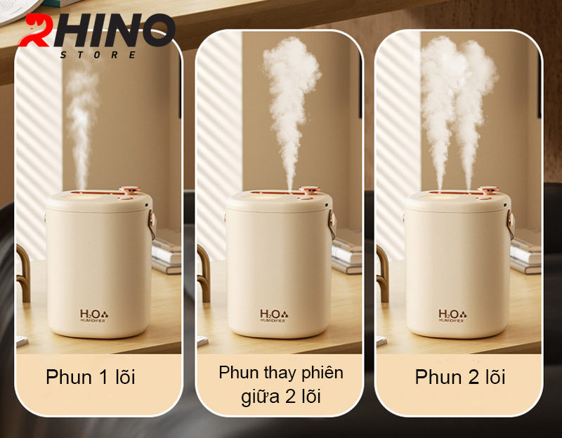 Máy phun sương tạo ẩm tinh dầu Rhino H808 1200ml, 2 lõi phun tích hợp đèn, tiện lợi, dung tích lớn cho không gian rộng với ưu điểm 2 lõi phun siêu to sẽ làm thơm mát không gian sử dụng Máy phun sương tạo ẩm là một thiết bị rất cần thiết đối với mọi gia đình trong thời tiết khô hanh, độ ẩm thấp với tác dụng chính là cấp thêm độ ẩm trong không khí. Từ đó giúp da không bị mất nước, khô nứt nẻ đặc biệt vùng môi và da mặt tạo ra môi trường sống thoải mái và dễ chịu nhất, không còn mặc cảm khi tiếp xúc với mọi người. Khi kết hợp với tinh dầu sẽ tạo ra bầu không khí dễ chịu, tránh nấm mốc và côn trùng ruồi muỗi (không nên lạm dụng và phải chọn đúng tinh dầu chất lượng tốt)