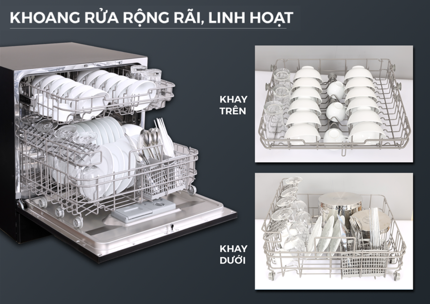 Máy rửa bát lắp đặt độc lập hoặc âm tủ Đặc tính sàn phẩm Dung tích 15 bộ bát đĩa Âu, Hệ thống điều khiển cảm ứng toàn diện 2 khay chứa cơ động +