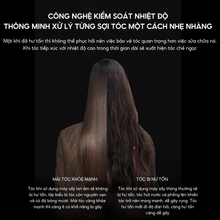 - Máy sấy ion âm giúp bảo vệ mái tóc sau khi sấy không bị tổn thương vì nhiệt