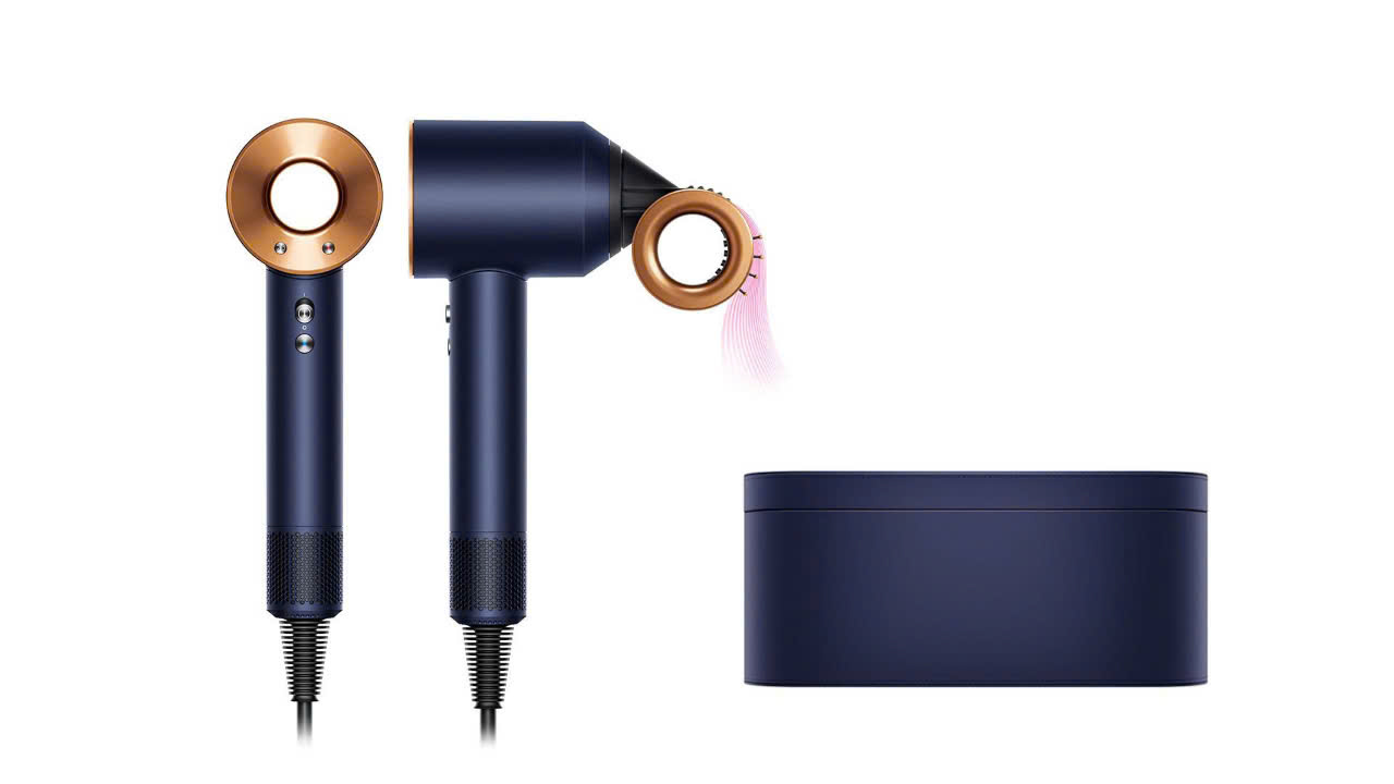Phiên bản đặc biệt mới Máy sấy tóc Dyson Supersonic. Giờ đây có màu xanh nước biển Phổ và đồng phong phú với hộp trình bày màu xanh nước biển Phổ do Dyson thiết kế. Làm khô