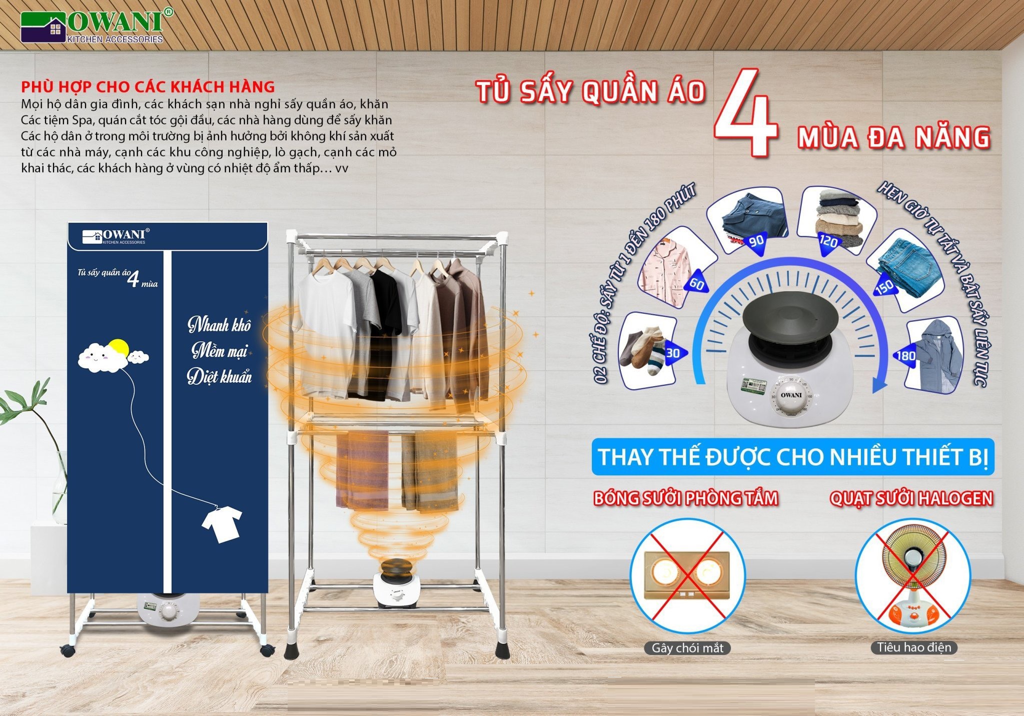 • Xuất xứ: Việt Nam Thời tiết mưa gió, độ ẩm cao chính là nguyên nhân gây ra các ổ dịch cho vi khuẩn và nấm mốc trên quần áo. Không những khiến cho người mặc sự khó chịu, thiếu tự tin, chúng còn gây ra các bệnh ngoài da như mẩn ngứa hoặc viêm loét, chúng cũng có thể ảnh hưởng đến hệ hô hấp, tiêu hóa của người sử dụng. Với khả năng làm khô tại chỗ nhanh chóng mà không ảnh hưởng đến chất liệu quần áo, Máy Sấy - Tủ Sấy Quần Áo Owani TS-OW001 - Màu Ngẫu Nhiên - Hàng Chính Hãng chính là giải pháp hoàn hảo cho việc giặt giũ trong những ngày nồm ẩm. KIỂU DÁNG GỌN NHẸ  - THÔNG MINH – TIỆN DỤNG Thiết kế đơn giản và thuận tiện Máy Sấy - Tủ Sấy Quần Áo Owani TS-OW001 - Màu Ngẫu Nhiên - Hàng Chính Hãng có kiểu dáng đơn giản và thiết kế thuận tiện, vô cùng gọn nhẹ, dễ dàng đặt ở nhiều vị trí khác nhau. Đồng thời, màu xanh trẻ trung của chiếc máy sấy sẽ làm điểm nhấn cho gian phòng trở nên đẹp mắt và sáng sủa hơn. Núm xoay đơn giản Máy sấy có các mức thời gian sấy khác nhau được điều chỉnh bằng núm vặn đơn giản, dễ sử dụ   SẤY KHÔ NHANH CHÓNG – TIẾT KIỆM THỜI GIAN -  AN TOÀN SỨC KHỎE Quần áo được giảm nhăn nhờ phương pháp sấy khô tĩnh học Máy Sấy - Tủ Sấy Quần Áo Owani TS-OW001 - Màu Ngẫu Nhiên - Hàng Chính Hãng sử dụng phương pháp làm khô tĩnh học tức là làm khô nhờ nhiệt đối lưu giúp sấy khô nhanh quần áo tránh làm mài mòn hay làm nhăn quần áo một cách hiệu quả. Cùng với đó, công nghệ sấy cộng hưởng nhiệt PTC trên máy sấy giúp tăng khả năng bảo vệ quần áo lên gấp 2 lần, tránh làm hư tổn quần áo. Tiết kiệm thời gian, công sức Sản phẩm có lồng phân nhiệt thiết kế 360 độ C giúp cho khí nóng được lan tỏa đều khi máy hoạt động, từ đó quần áo sẽ được sấy khô toàn diện. Kết hợp cùng quạt gió tốc độ nhanh, máy có thể sấy được tối 20kg quần áo cùng lúc (trong vòng 1 – 3 tiếng). Diệt sạch vi khuẩn, bảo vệ gia đình Dưới nhiệt độ cao giúp nâng cao hiệu quả khử sạch bụi bẩn và vi khuẩn. Đem lại cho cả gia đình những bộ quần áo sạch khuẩn, đảm bảo sức khỏe đến mức tối đa cho cả gia đình. Sản phẩm đa chức năng Máy Sấy - Tủ Sấy Quần Áo Owani TS-OW001 - Màu Ngẫu Nhiên - Hàng Chính Hãng không chỉ dùng để sấy khô mà còn có thể làm ấm quần áo hoặc căn phòng trong mùa đông; trở thành giá treo để quần áo luôn thẳng nếp hay bảo quản, lưu giữ quần áo cho gia đình…