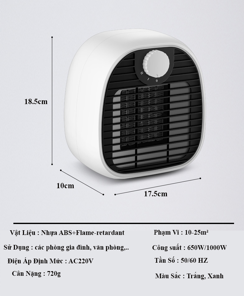 Quạt sưởi mini hoạt động với công suất lên tới 1000w, điện áp 220V, phạm vi phát nhiệt rộng, có khả năng làm ấm nóng nhanh chóng cho những diện tích vừa phải, tiện dụng cho sưởi ấm các phòng nhỏ hoặc sưởi ấm trực tiếp gần cơ thể. Cũng có thể mang vào sưởi ấm trong phòng tắm hoặc sưởi ấm khi tắm cho trẻ sơ sinh.