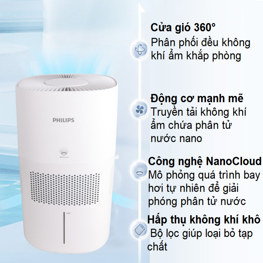 - Máy phun sương 360 độ khuếch tán đều không khí ẩm khắp phòng. Hơi nước NanoCloud siêu mịn mang nhiều độ ẩm hơn và ngăn quá trình bão hòa, đặc biệt là để tạo độ ẩm hiệu quả trong không gian rộng Không có sương trắng hoặc tích tụ nước