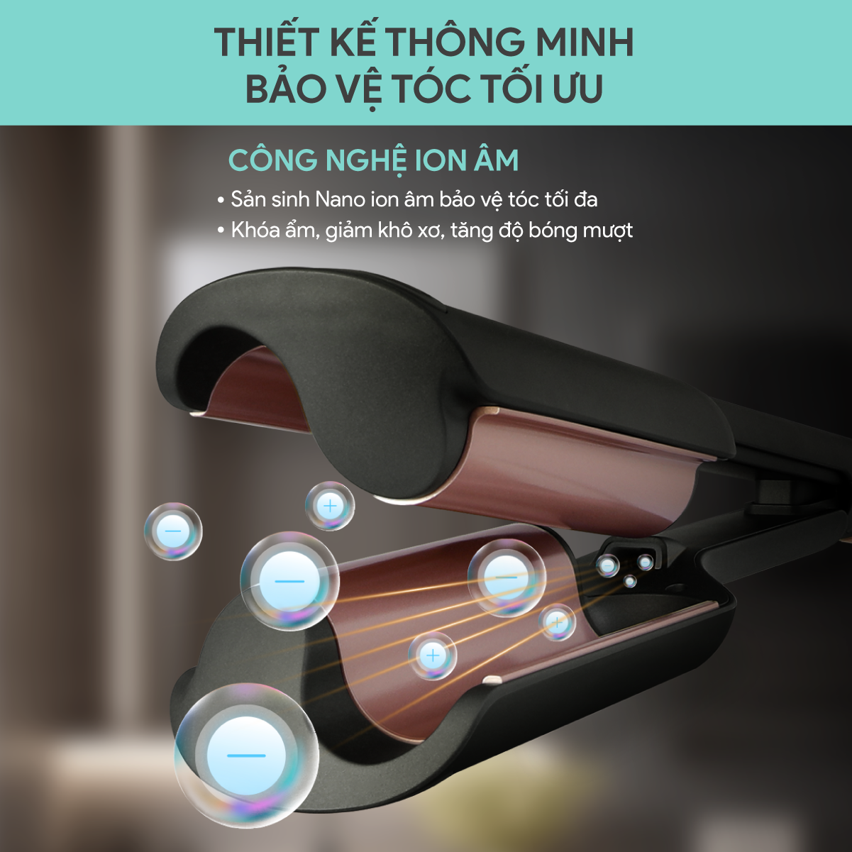 - Rãnh sâu với hai trục uốn kích thước 32mm tạo mái tóc uốn sóng bồng bềnh