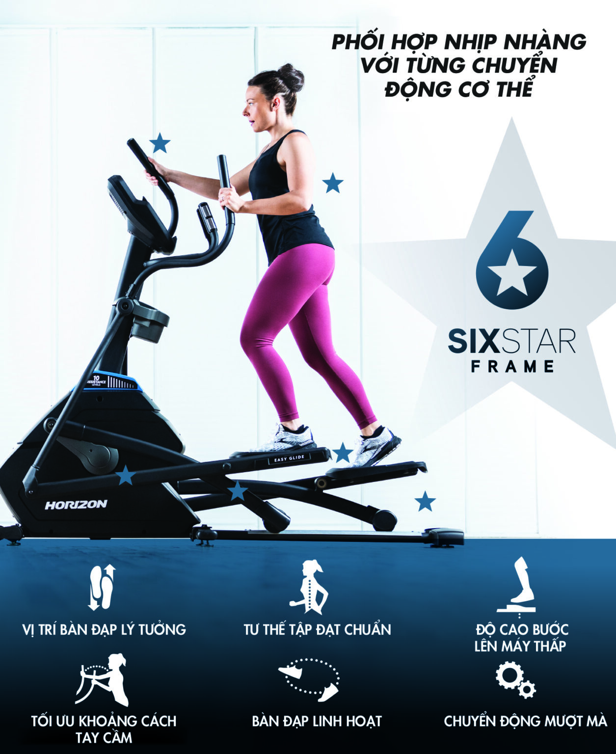 Máy tập liên hoàn Horizon EX59-24 giúp bạn luyện tập thoải mái nhất với thiết kế Sixstar độc quyền, giúp bạn trải nghiệm từng nhịp đạp êm ái. Thử thách bản thân cùng đa dạng bài tập