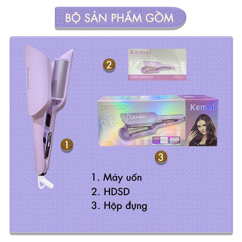 MÁY UỐN TÓC SÓNG KEMEI KM-3119 TRỤC LỚN ĐIỀU CHỈNH 6 MỨC NHIỆT ĐỘ PHÙ HỢP VỚI MỌI LOẠI TÓC - HÀNG CHÍNH HÃNG Máy uốn tóc sóng trục lớn Kemei KM-3119 – bí quyết để bạn sở hữu mái tóc gợn sóng bồng bềnh, quyến rũ ngay tại nhà! Với thiết kế trục uốn 36mm hiện đại, 6 mức nhiệt độ tùy chỉnh và khả năng làm nóng nhanh chỉ trong 30 giây, KM-3119 giúp bạn dễ dàng tạo kiểu chuyên nghiệp mà vẫn bảo vệ mái tóc khỏi hư tổn. Công suất mạnh 60W cho hiệu suất ổn định, mang lại hiệu quả nhanh chóng, tiết kiệm thời gian mỗi ngày. Kemei KM-3119 – đẹp chuẩn salon, dễ dàng trong tầm tay! ƯU ĐIỂM NỔI BẬT: