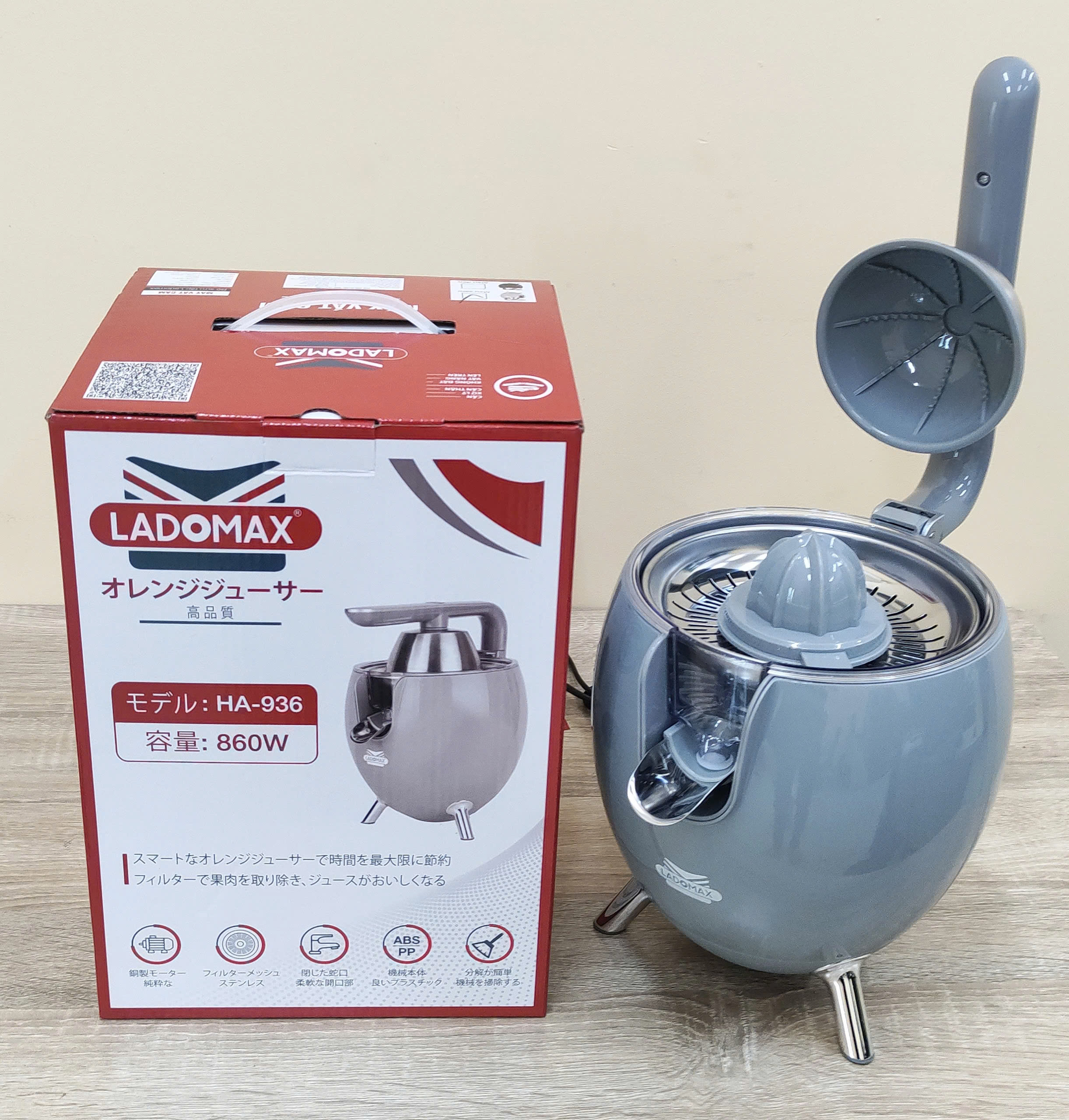 Thông tin sản phẩm Thương hiệu: Ladomax Máy: Máy vắt cam, vắt chanh Công suât: 860W Model :HA936 Núm: 2 đầu nấm lớn nhỏ Khay lọc: Inox Điện áp: 220-240V, 50/60HZ Bảo hành 12 tháng