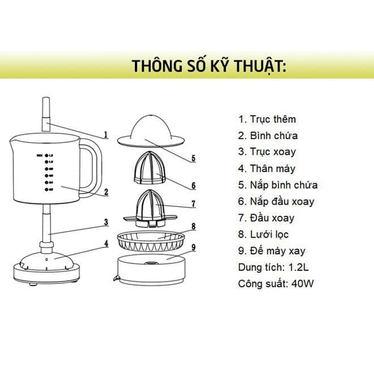 THÔNG SỐ KỸ THUẬT: - Chức năng: Vắt quýt, Vắt cam, Vắt chanh - Công suất - Dung tích: 40W - 0.85 lít - Tốc độ: 1 tốc độ - Chất liệu lưới lọc: Thép