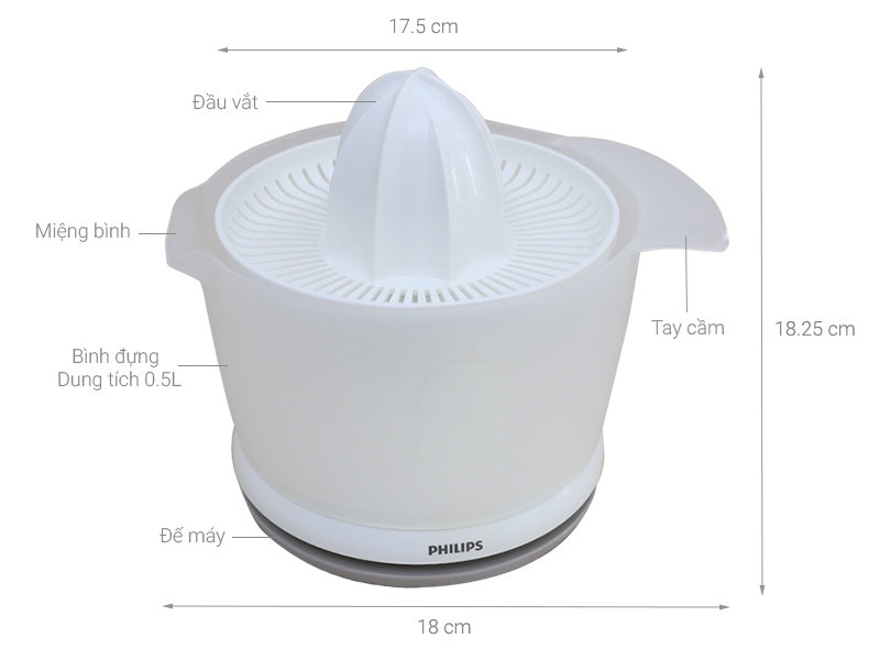 - Máy vắt cam Philips thích hợp sử dụng vắt các loại quả có múi. Sản phẩm thích hợp sử dụng cho gia đình có nhu cầu thích uống nước cam, quýt nhiều, vắt khoảng 10 trái trở lên hoặc nhu cầu kinh doanh quy mô nhỏ. - Ly đựng dung tích 0.5 lít có khả năng chứa được lượng lớn nước ép, bạn có thể vắt liên tục 4 - 5 quả cam mà không phải tốn công tháo lưới lọc để rót nước ép ra cốc uống nhiều lần.
