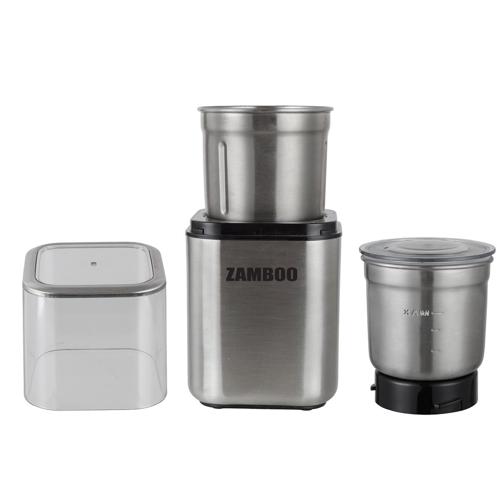 -Máy xay 2 chức năng Zamboo là vật dụng dùng trong nhà bếp, thiết kế cho các chức năng xay đồ khô và xay đồ ướt, với 2 cốc xay bằng inox có thể tháo rời để thay thế. Cối xay khô thiết kế 1 lưỡi dao đôi, dùng xay các loại hạt khô, gia vị khô như cà phê, tiêu, đậu, gạo rang, hay các loại hạt ngũ cố Cối xay ướt thiết kê 2 lưỡi dao đôi, dùng xay đồ có nước như gừng, tỏi, ớt, nghệ
