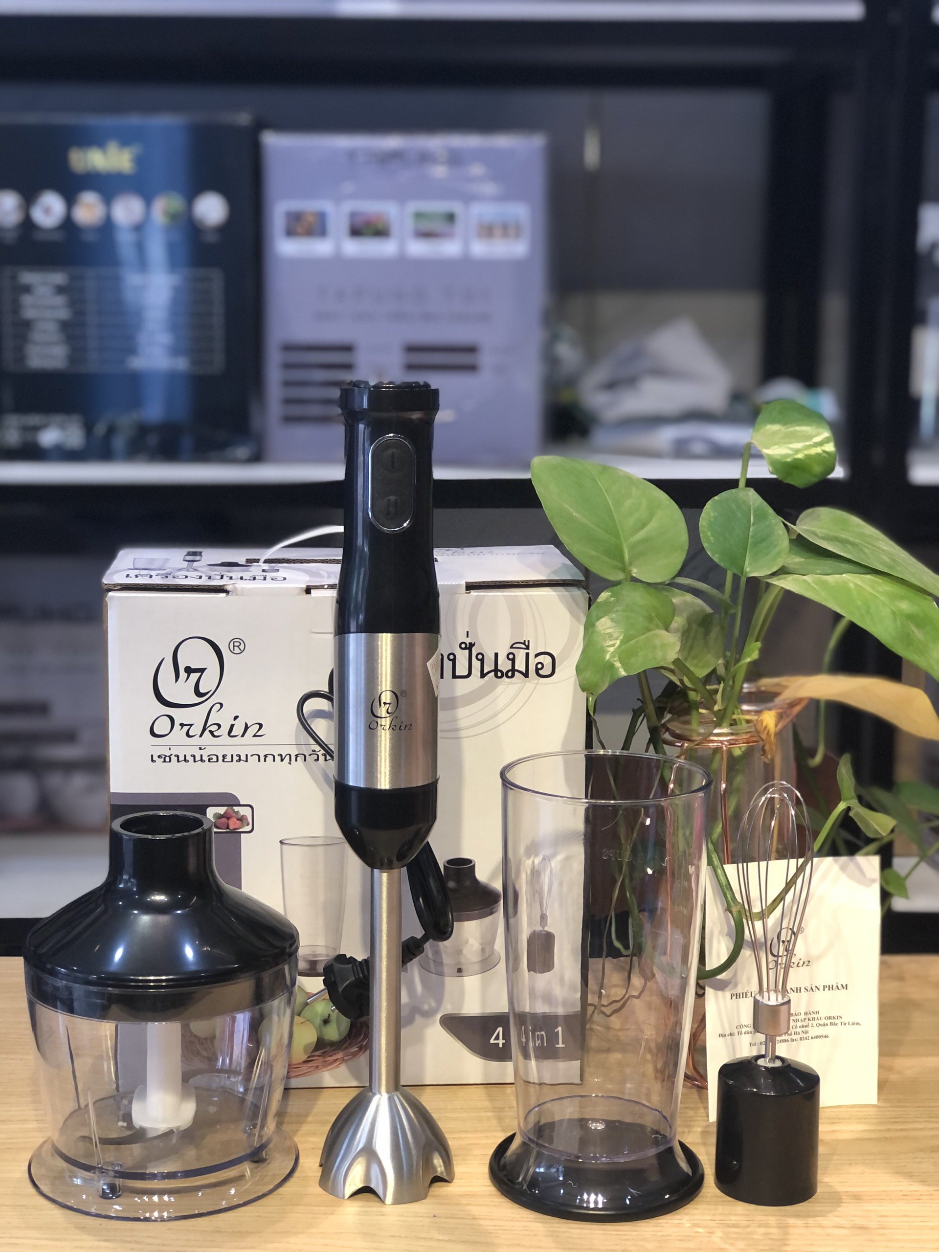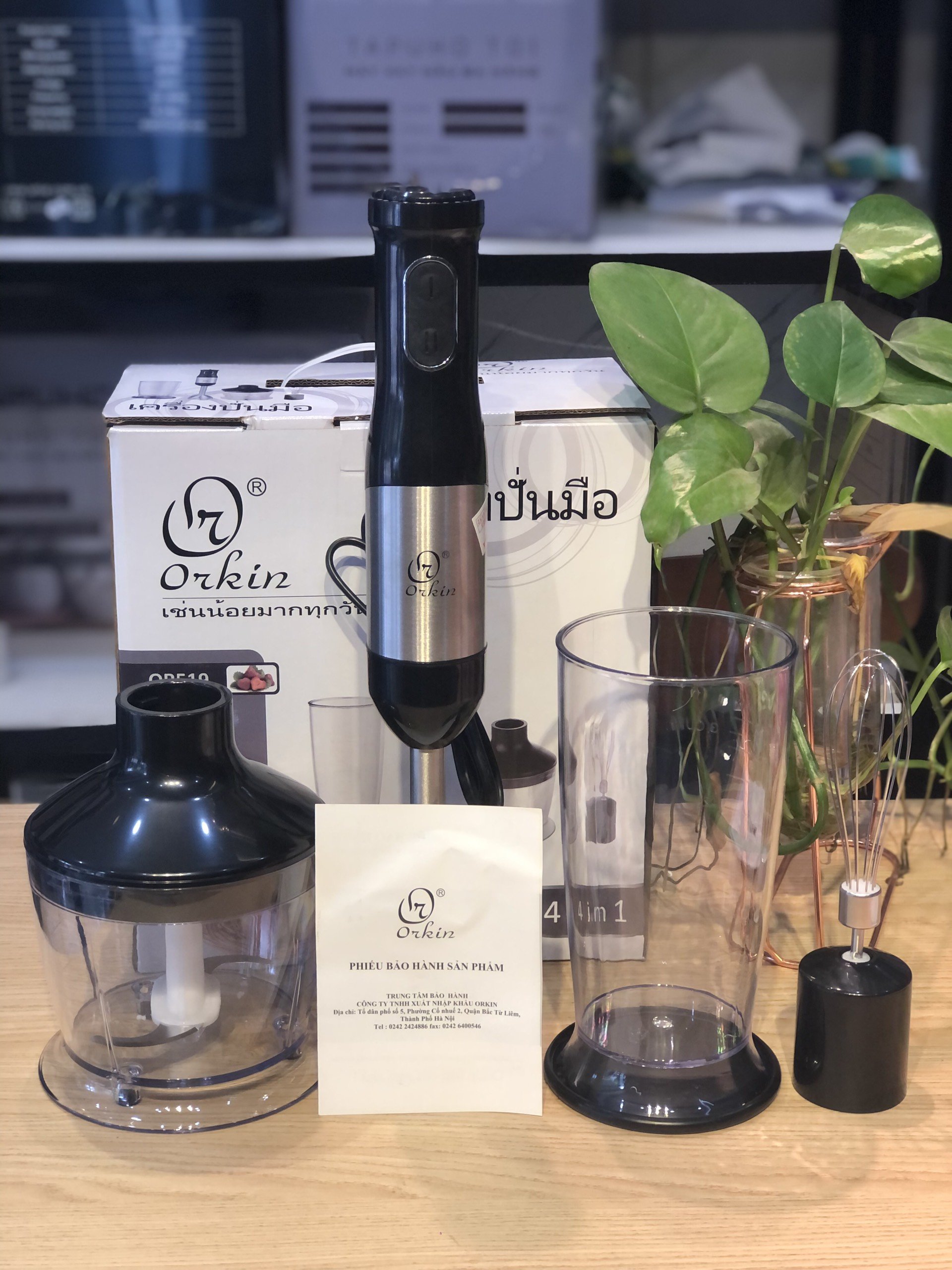 Máy xay cầm tay đa năng 4 trong 1 Orkin Thái Lan OR519 bảo hành 12 tháng Loại: Máy xay cầm tay đa năng Loại điều khiển: Nút bấm Model: OR519 Thương hiệu: Orkin Thái Lan Công nghệ sản xuất Thái Lan Công suất: 800W Điện áp: 220V - 50Hz Kích thước đóng hộp: 35 x 30 x 20 cm Trọng lượng: 2.2 kg Dụng tích: 500ml Chất liệu: Nhựa không chứa BPA, lưỡi dao Thép không gỉ Chức năng: Máy xay sinh tố, máy xay thực phẩm, máy đánh trứng, Xay Thịt, Xay Ngũ Cốc ... kèm theo cốc đựng Tốc độ vòng quay: 15000 RPM Sản xuất tại Trung Quốc Bảo hành 12 tháng chính hãng bởi Tập Đoàn Orkin Thái Lan - Việt Nam Đặc điểm nổi bật