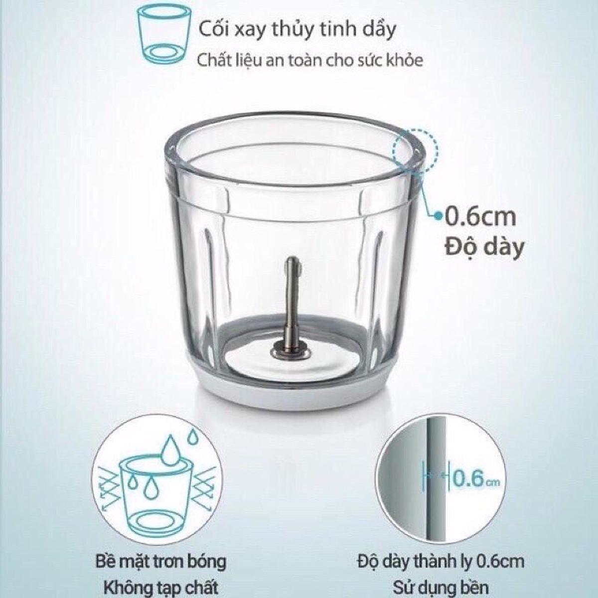 Nhỏ gọn, vệ sinh rất thuận tiện. Cối thủy tinh đúc nguyên khối, chịu lực