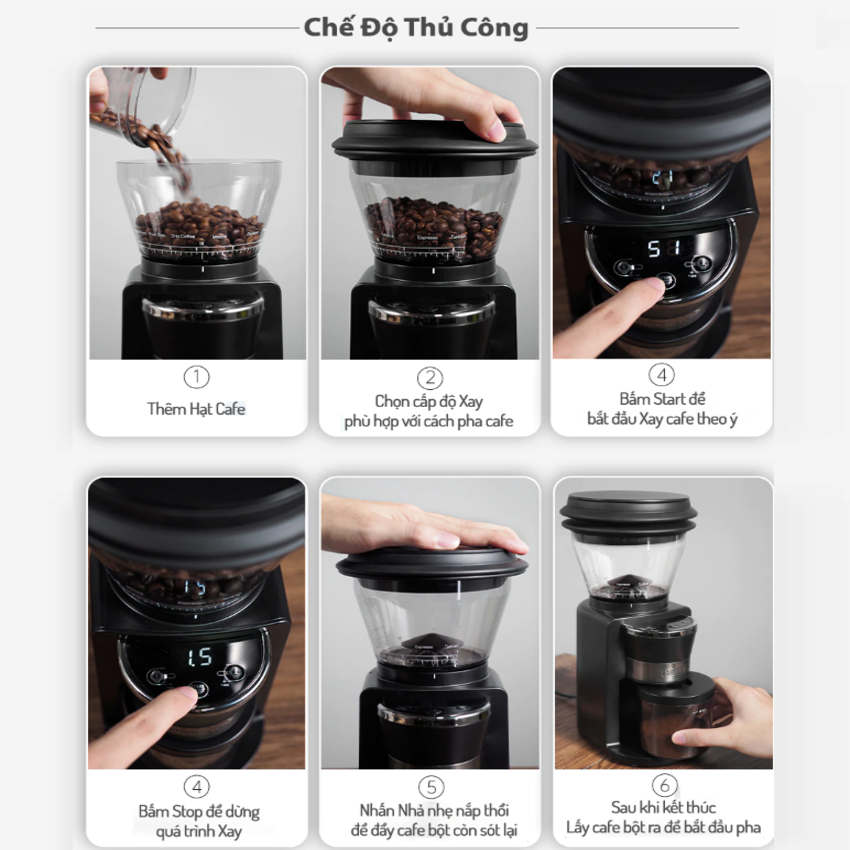 - Khay chứa cà phê trong suốt giúp bạn dễ dàng quan sát cà phê đang xay đồng thời dễ dàng tháo lắp tạo sự thuận tiện cho bạn khi chùi rửa.