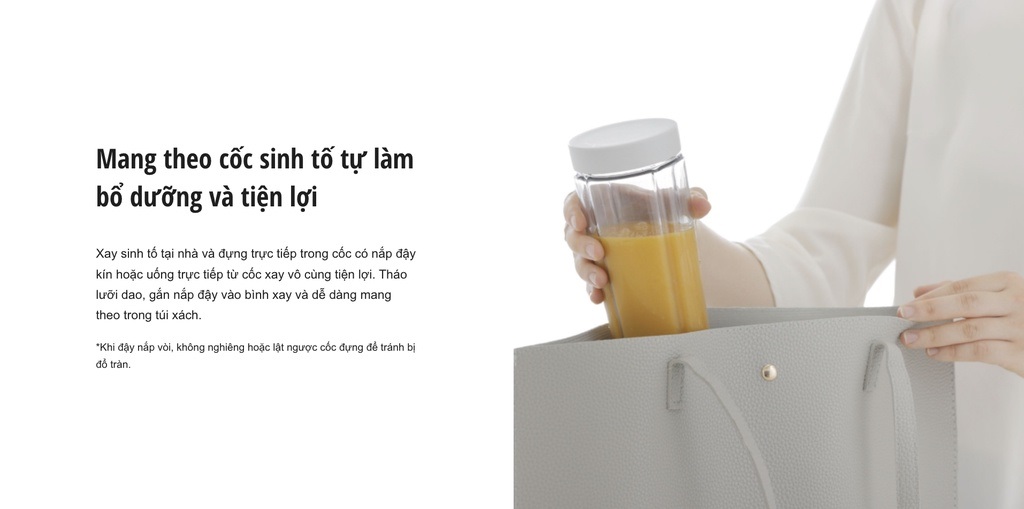 - Xay sinh tố tại nhà và đựng trực tiếp trong cốc có nắp đậy kín hoặc uống trực tiếp từ cốc xay vô cùng tiện lợi. Tháo lưỡi dao, gắn nắp đậy vào bình xay và dễ dàng mang theo trong túi xách.