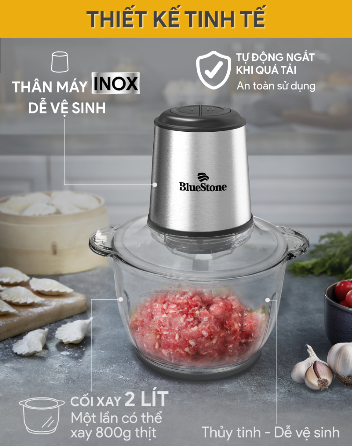 Mua tại TiktokMáy xay thịt BlueStone giúp người nội trợ hiện đại chế biến món thịt xay nhuyễn mịn tại nhà, an toàn sức khỏe cho cả gia đình nhờ việc chủ động lựa chọn loại thịt, nắm rõ thời gian xay và sử dụng thành phẩm. Sử dụng máy xay thịt còn giúp tiết kiệm thời gian và công sức thay vì phải băm thịt bằng tay mất thời gian, đồng thời thiết kế và chất liệu máy xay thịt cực kỳ dễ vệ sinh.