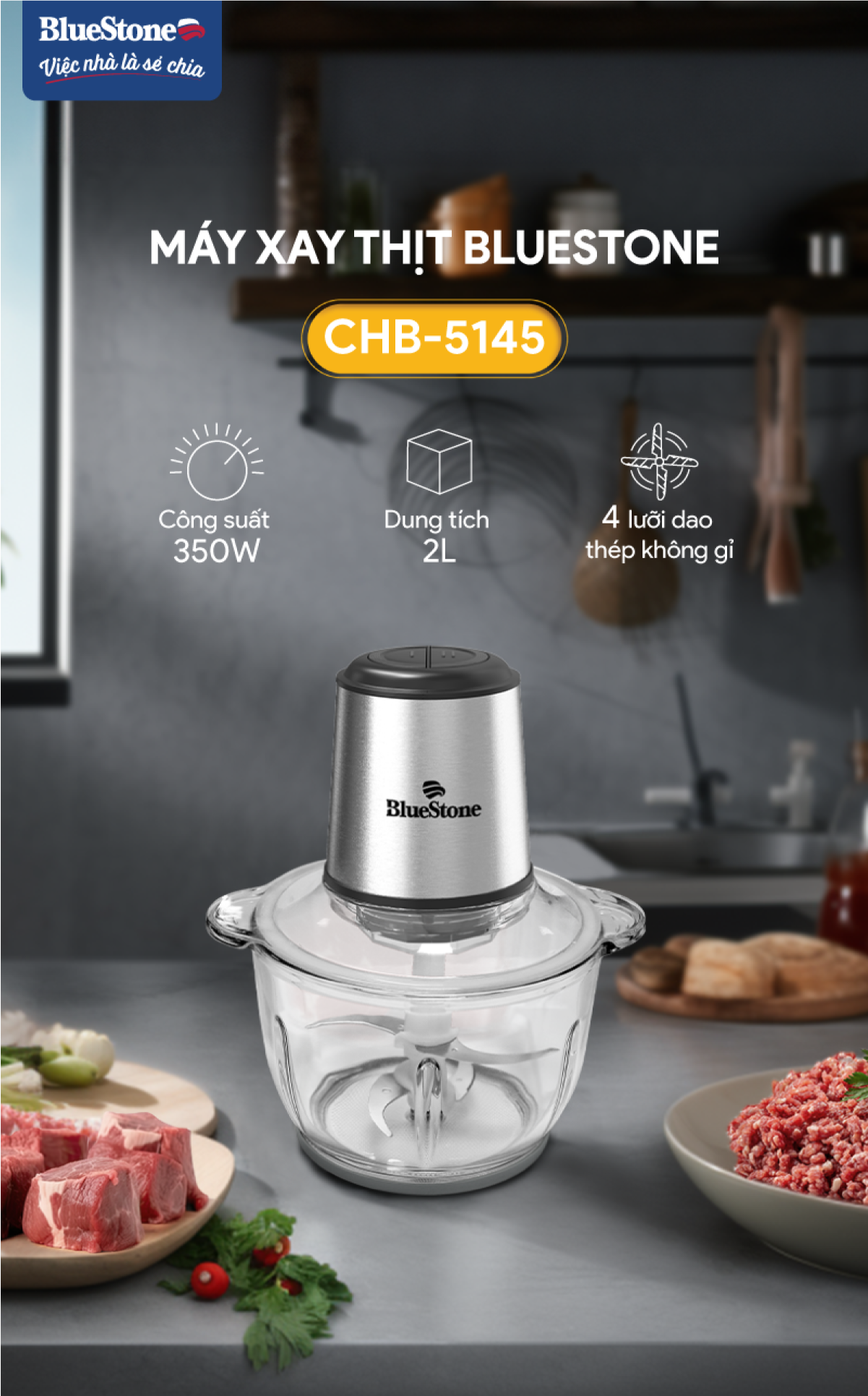 - Thông số kỹ thuật máy xay thịt BlueStone CHB-5145 Công suất: 350W Tốc độ xay: 2 tốc độ Dung tích cối: 2 lít Chất liệu cối: Thủy tinh cao cấp Lưỡi dao: 2 lưỡi dao kép bằng thép không gỉ
