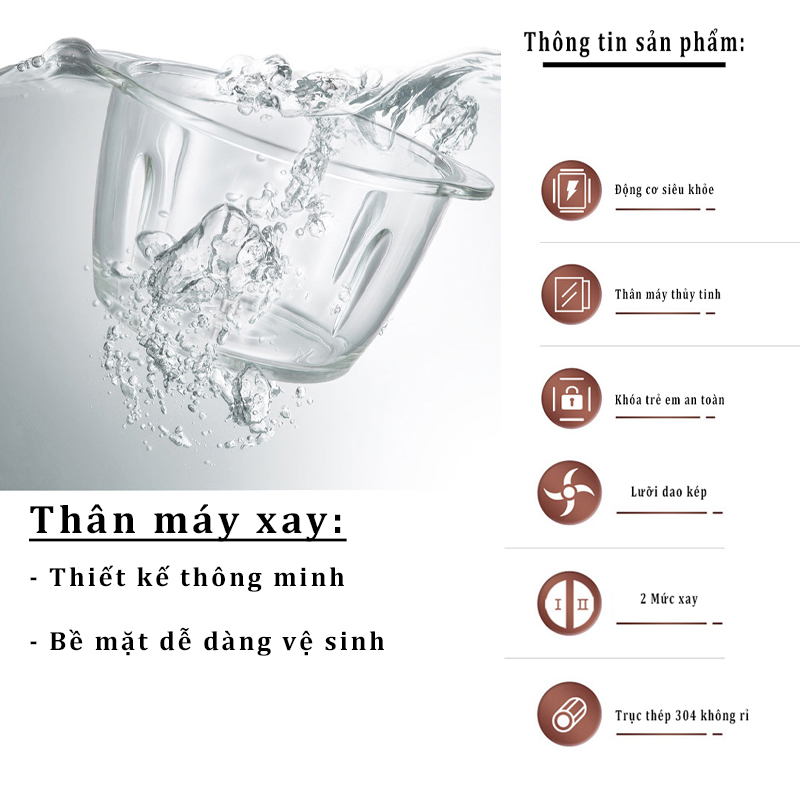 Công suất 200W hoạt động bằng một nút bấm đơn giản Lưỡi dao 2 cánh sắc bén bằng thép không gỉ Thiết kế nhỏ gọn, trọng lượng chỉ 1,63kg Cối thủy tinh dung tích 1L