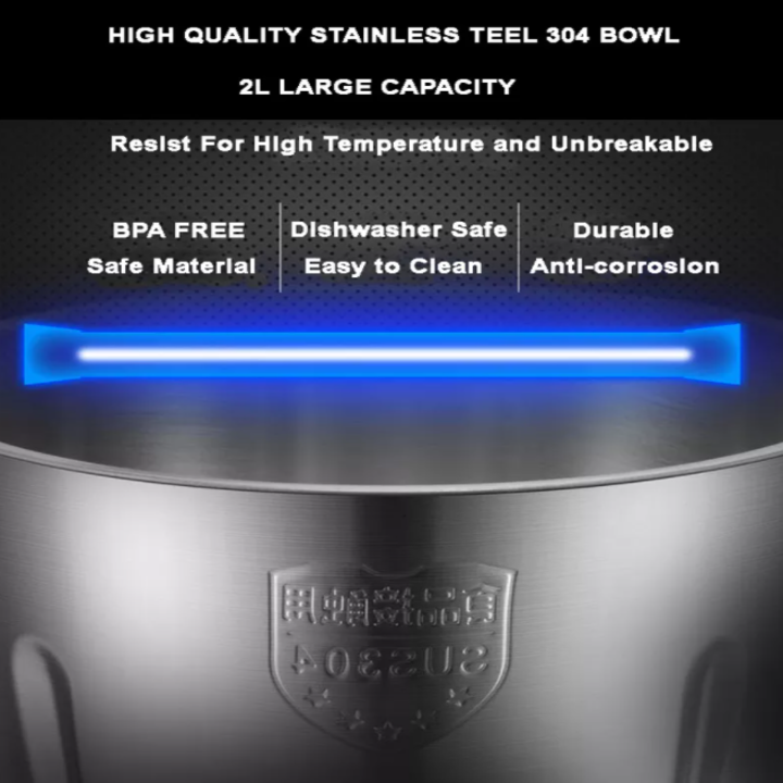 Dung tích: 2L Công suất: 250W Nguồn điện : 220v- 50Hz Vỏ máy: Chất liệu Inox 304 cao cấp, chịu nhiệt Lưỡi dao: Thiết kế 4 lưỡi bằng thép không gỉ – Sắc bén cho