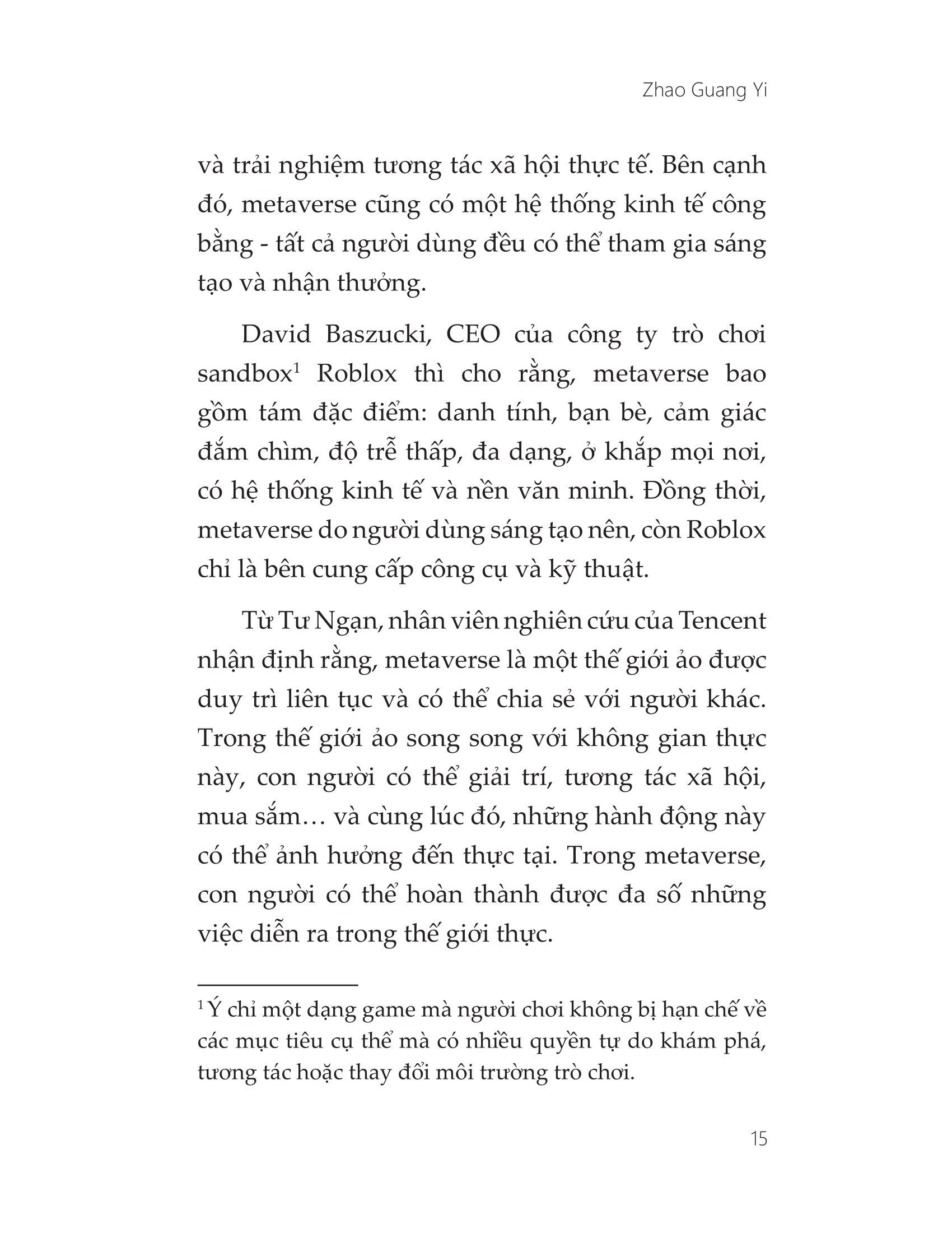 Nhiều công ty và các start-up đau đầu vì không biết làm thế nào để tham gia vào lĩnh vực metaverse do họ không có đủ vốn và tiềm lực công nghệ. Để khắc phục những vấn đề này, cuốn sách trên tay bạn sẽ mô tả toàn diện tư duy triển khai metaverse, giới thiệu những nội dung có thể khai thác cũng như cách kết hợp metaverse vào hoạt động kinh doanh. Ngoài việc cung cấp lý thuyết về metaverse, cuốn sách này còn thảo luận về các trường hợp thực tế của nhiều công ty và phân tích các cơ hội tiềm năng trong metaverse. Đây là một cuốn sách mang tính định hướng, có thể giúp các công ty, start-up hiểu rõ hơn về con đường phía trước.