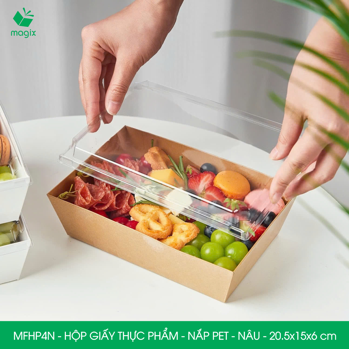QUY CÁCH KỸ THUẬT Mã sản phẩm - Kích thước: • MFHP1N - Hộp giấy Kraft thực phẩm nắp Pet - Nâu - 10.5x10.5x6 cm • MFHP1T - Hộp giấy thực phẩm nắp Pet - Trắng - 10.5x10.5x6 cm • MFHP2N - Hộp giấy Kraft thực phẩm nắp Pet - Nâu - 15.5x8.5x6 cm • MFHP2T - Hộp giấy thực phẩm nắp Pet - Trắng - 15.5x8.5x6 cm • MFHP3N - Hộp giấy Kraft thực phẩm nắp Pet - Nâu - 20x12.5x6 cm • MFHP3T - Hộp giấy thực phẩm nắp Pet - Trắng - 20x12.5x6 cm • MFHP4N - Hộp giấy Kraft thực phẩm nắp Pet - Nâu - 20.5x15x6 cm • MFHP4T - Hộp giấy thực phẩm nắp Pet - Trắng - 20.5x15x6 cm • MFHP5N - Hộp giấy Kraft thực phẩm nắp Pet - Nâu - 12x12x6.5 cm • MFHP5T - Hộp giấy thực phẩm nắp Pet - Trắng - 12x12x6.5 cm • MFHP6N - Hộp giấy Kraft thực phẩm nắp Pet - Nâu - 14.5x13x6 cm • MFHP6T - Hộp giấy thực phẩm nắp Pet - Trắng - 14.5x13x6 cm • MFHP7N - Hộp giấy Kraft thực phẩm nắp Pet - Nâu - 19.5x9x6 cm • MFHP7T - Hộp giấy thực phẩm nắp Pet - Trắng - 19.5x9x6 cm