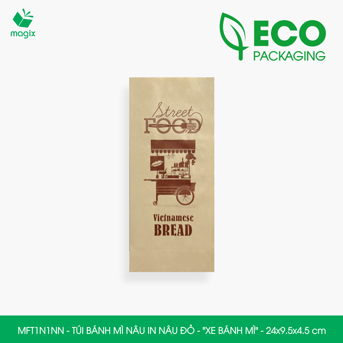 ĐẶC ĐIỂM SẢN PHẨM Chất liệu: Túi bánh mì in thường được làm từ giấy kraft nhật định lượng 50gsm thấm dầu có giấy chứng nhận FDA đảm bảo vệ sinh an toàn thực phầm Thiết kế: Miệng túi thiết kế chia thành 2 lớp dễ dàng thao tác bỏ bánh mì vào túi, đơn giản và tiện dụng    CÔNG DỤNG Tiện lợi: Bảo vệ bánh mì khỏi bụi bẩn, môi trường ô nhiễm, tác động từ bên ngoài và tránh làm dơ tay khi sử dụng Quảng cáo thương hiệu: Túi bánh mì in được sử dụng như một phương tiện quảng cáo nhỏ gọn và hiệu quả, với thiết kế in ấn logo, thông tin về sản phẩm và các thông điệp quảng cáo khác Bảo vệ môi trường: Túi bánh mì được làm từ chất liệu giấy kraft nguyên sinh, giúp giảm thiểu lượng rác thải nhựa và bảo vệ môi trường Tiết kiệm chi phí: Túi giấy bánh mì có giá thành thấp hơn so với các loại bao bì khác như hộp giấy, hộp nhựa đựng bánh mì   TIÊU CHUẨN KỸ THUẬT Chất liệu: Giấy Kraft chuyên dùng cho thực phẩm đạt tiêu chuẩn FDA  Định lượng: 50gsm Mã hàng - Kiểu in - Kích thước  • MFT1N5NN - Túi bánh mì nâu in nâu - "Giỏ bánh mì" - 24x9.5x4.5 cm  • MFT1T5N - Túi bánh mì trắng in nâu - "Giỏ bánh mì" - 24x9.5x4.5 cm  • MFT1N4X - Túi bánh mì nâu in xanh lá - "Best street food" - 24x9.5x4.5 cm  • MFT1T4X - Túi bánh mì trắng in xanh lá - "Best street food" - 24x9.5x4.5 cm  • MFT1N4NN - Túi bánh mì nâu in nâu đỏ - "Best street food" - 24x9.5x4.5 cm  • MFT1T4N - Túi bánh mì trắng in nâu - "Best street food" - 24x9.5x4.5 cm  • MFT1T3C - Túi bánh mì trắng in cam - "Đầu bếp" - 24x9.5x4.5 cm  • MFT1N3NN - Túi bánh mì nâu in nâu đỏ - "Đầu bếp" - 24x9.5x4.5 cm  • MFT1T3NN - Túi bánh mì trắng in nâu đỏ - "Đầu bếp" - 24x9.5x4.5 cm  • MFT1N2NN - Túi bánh mì nâu in nâu đỏ - "Cối xay gió" - 24x9.5x4.5 cm  • MFT1T2N - Túi bánh mì trắng in nâu - "Cối xay gió" - 24x9.5x4.5 cm  • MFT1N1NN - Túi bánh mì nâu in nâu đỏ - "Xe bánh mì" - 24x9.5x4.5 cm  • MFT1T1N - Túi bánh mì trắng in nâu - "Xe bánh mì" - 24x9.5x4.5 cm   LƯU Ý Bảo quản sản phẩm nơi khô ráo, sạch sẽ tránh tiếp xúc trực tiếp với ánh nắng mặt trời và nhiệt độ cao.