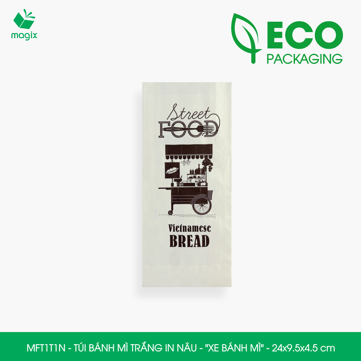 ĐẶC ĐIỂM SẢN PHẨM Chất liệu: Túi bánh mì in thường được làm từ giấy kraft nhật định lượng 50gsm thấm dầu có giấy chứng nhận FDA đảm bảo vệ sinh an toàn thực phầm Thiết kế: Miệng túi thiết kế chia thành 2 lớp dễ dàng thao tác bỏ bánh mì vào túi, đơn giản và tiện dụng CÔNG DỤNG Tiện lợi: Bảo vệ bánh mì khỏi bụi bẩn, môi trường ô nhiễm, tác động từ bên ngoài và tránh làm dơ tay khi sử dụng Quảng cáo thương hiệu: Túi bánh mì in được sử dụng như một phương tiện quảng cáo nhỏ gọn và hiệu quả, với thiết kế in ấn logo, thông tin về sản phẩm và các thông điệp quảng cáo khác Bảo vệ môi trường: Túi bánh mì được làm từ chất liệu giấy kraft nguyên sinh, giúp giảm thiểu lượng rác thải nhựa và bảo vệ môi trường Tiết kiệm chi phí: Túi giấy bánh mì có giá thành thấp hơn so với các loại bao bì khác như hộp giấy, hộp nhựa đựng bánh mì TIÊU CHUẨN KỸ THUẬT Chất liệu: Giấy Kraft chuyên dùng cho thực phẩm đạt tiêu chuẩn FDA Định lượng: 50gsm Mã hàng - Kiểu in - Kích thước • MFT1N5NN - Túi bánh mì nâu in nâu - "Giỏ bánh mì" - 24x9.5x4.5 cm • MFT1T5N - Túi bánh mì trắng in nâu - "Giỏ bánh mì" - 24x9.5x4.5 cm • MFT1N4X - Túi bánh mì nâu in xanh lá - "Best street food" - 24x9.5x4.5 cm • MFT1T4X - Túi bánh mì trắng in xanh lá - "Best street food" - 24x9.5x4.5 cm • MFT1N4NN - Túi bánh mì nâu in nâu đỏ - "Best street food" - 24x9.5x4.5 cm • MFT1T4N - Túi bánh mì trắng in nâu - "Best street food" - 24x9.5x4.5 cm • MFT1T3C - Túi bánh mì trắng in cam - "Đầu bếp" - 24x9.5x4.5 cm • MFT1N3NN - Túi bánh mì nâu in nâu đỏ - "Đầu bếp" - 24x9.5x4.5 cm • MFT1T3NN - Túi bánh mì trắng in nâu đỏ - "Đầu bếp" - 24x9.5x4.5 cm • MFT1N2NN - Túi bánh mì nâu in nâu đỏ - "Cối xay gió" - 24x9.5x4.5 cm • MFT1T2N - Túi bánh mì trắng in nâu - "Cối xay gió" - 24x9.5x4.5 cm • MFT1N1NN - Túi bánh mì nâu in nâu đỏ - "Xe bánh mì" - 24x9.5x4.5 cm • MFT1T1N - Túi bánh mì trắng in nâu - "Xe bánh mì" - 24x9.5x4.5 cm LƯU Ý Bảo quản sản phẩm nơi khô ráo, sạch sẽ tránh tiếp xúc trực tiếp với ánh nắng mặt trời và nhiệt độ cao.