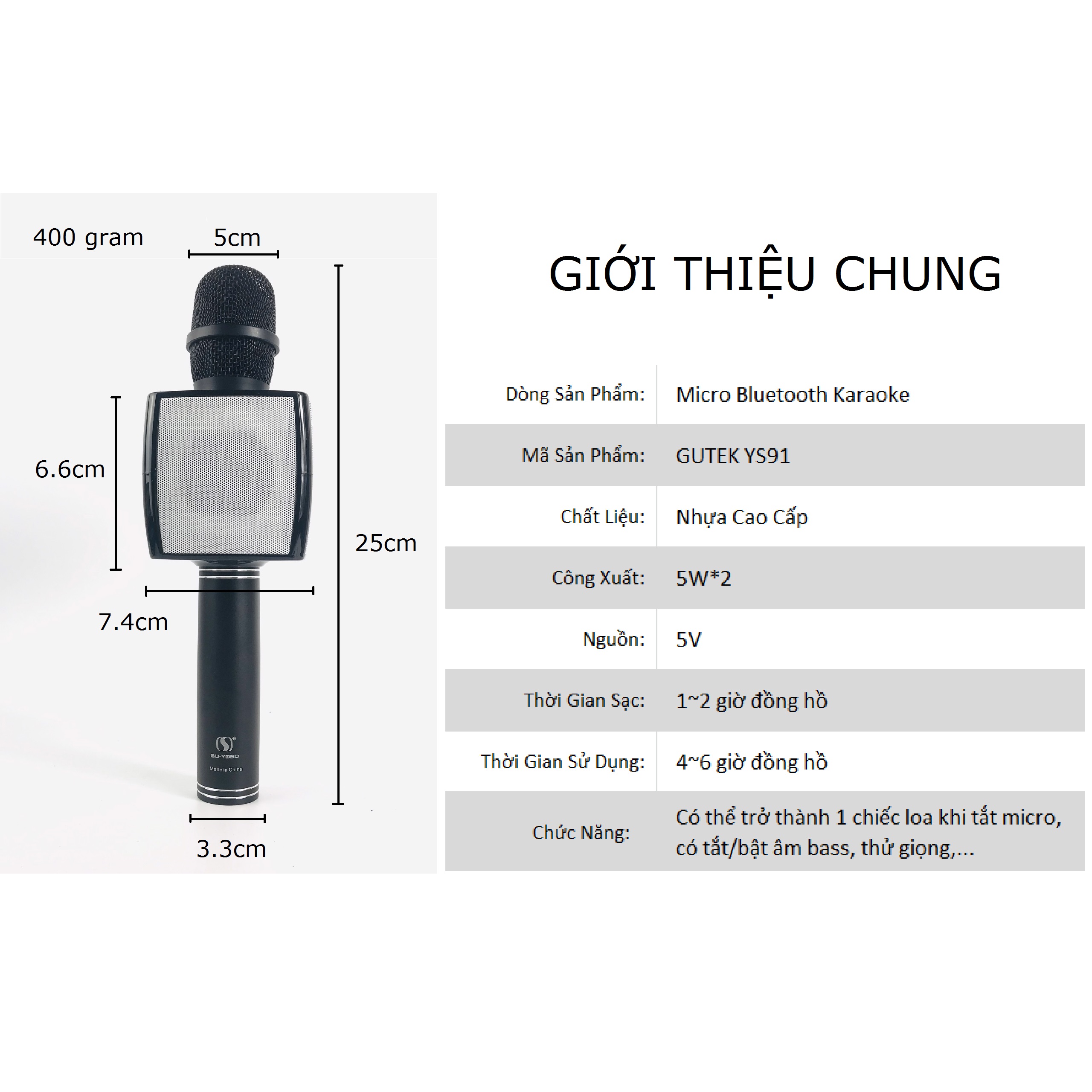 Micro Kèm loa Bass GUTEK YS91 kế thừa tất cả các tính năng của sản phẩm đàn anh, tuy nhiên có sự sáng tạo hơn về thiết kế: các góc cạnh được vát tròn, tạo cảm giác hiện đại, sang trọng hơn. Công suất cao, micro karaoke không dây kèm loa bluetooth GUTEK YS-91 khi sạc đầy có thể hoạt động từ 5-6 tiếng. Sản phẩm phù hợp để mang đi dã ngoại, đi du lịch, các buổi tiệc, họp mặt cùng bạn bè và người thân.