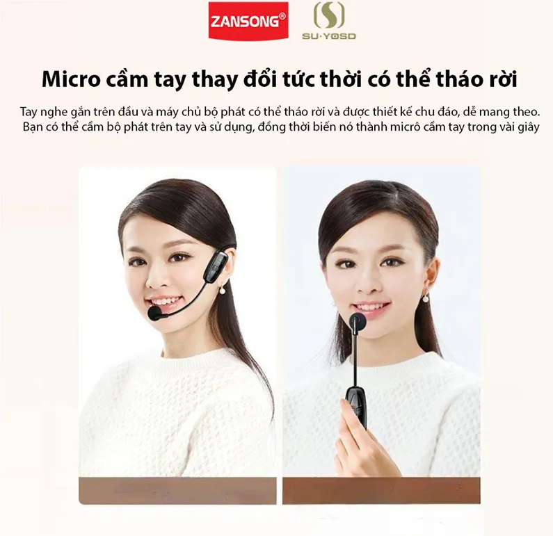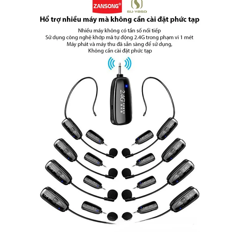 Mic không dây phát sóng 2.4G có thể xuyên tường Zansong V38 cho tất cả các loại loa có cổng mic, máy trợ giảng và nhiều loại khác. Microphone gài tai sử dụng công nghệ
