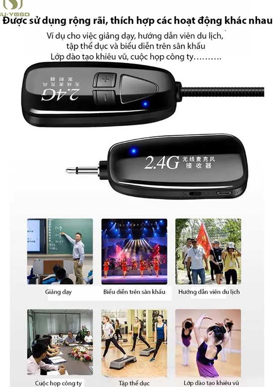 Microphone gài tai sử dụng công nghệ thu phát sóng 2.4G, mang lại hiệu quả tuyệt vời về thời gian sử dụng và cự ly thu phát