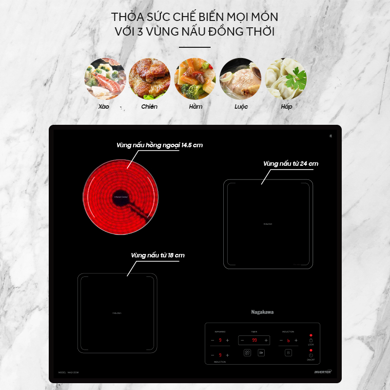 Nếu bạn muốn sở hữu một chiếc bếp từ có tới 3 vùng nấu rộng lớn để bạn có thể thoải mái nấu cùng lúc 3 món ăn thì bếp từ hồng ngoại Inverter Nagakawa NAG1253M là lựa chọn lý tưởng cho bạn.