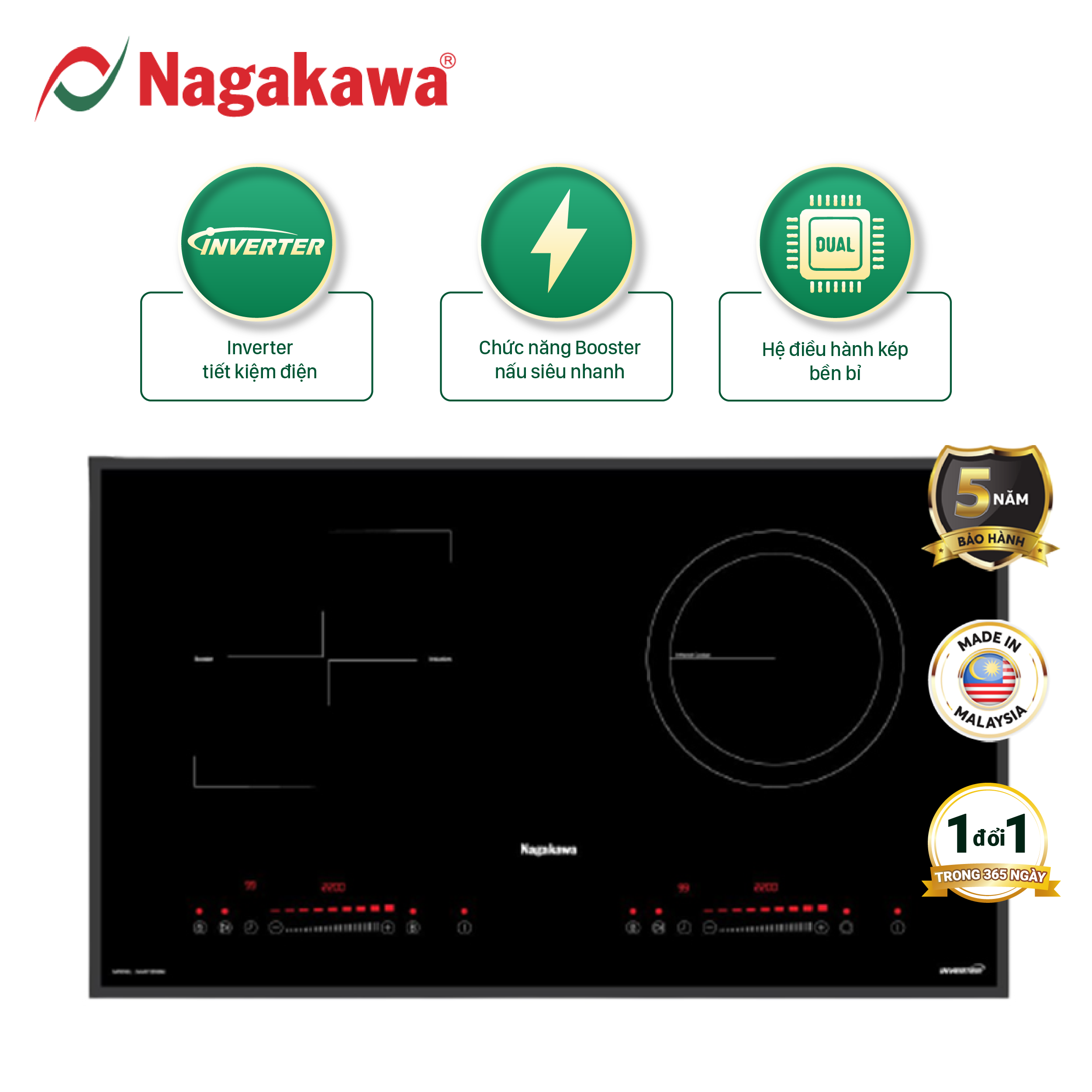 Đặc điểm nổi bật Bếp được tích hợp chức năng NaSYNC - Tự động kết nối điều khiển máy hút mùi nagakawa - Mỏng hơn 30% tiết kiệm không gian tủ bếp - Vật liệu
