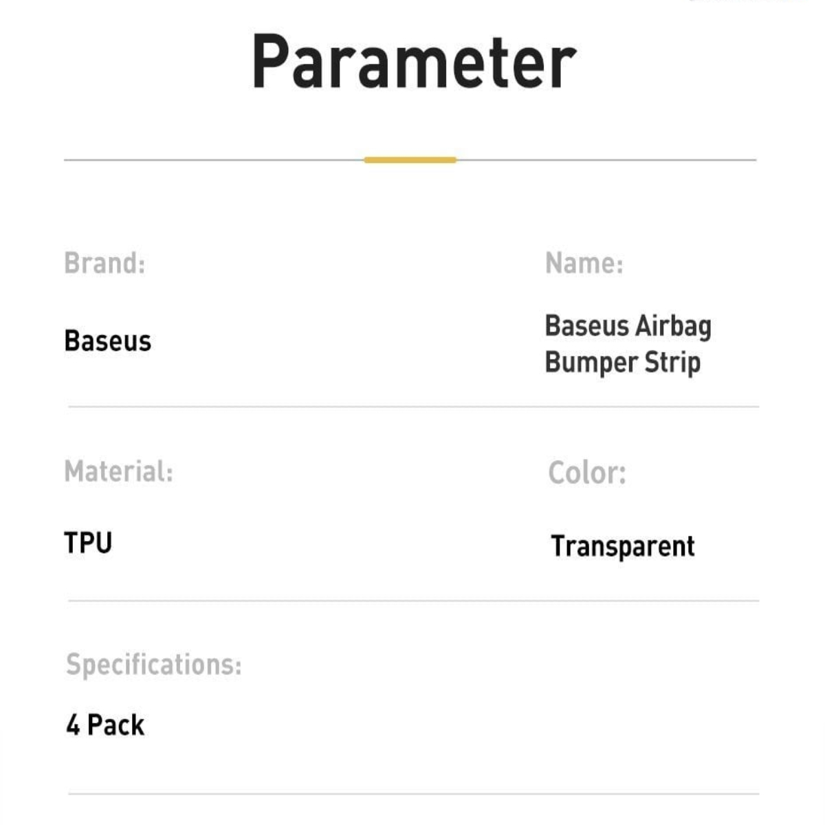 Giới thiệu Miếng dán cao su chống trầy gắn cửa dùng cho ô tô Baseus Airbag Bumper Strip (bộ 4 cái, trong suốt) Thương hiệu: Baseus Tên sản phẩm: Đệm cao su chống trầy gắn cửa xe hơi Baseus Airbag Bumper Strip Chất